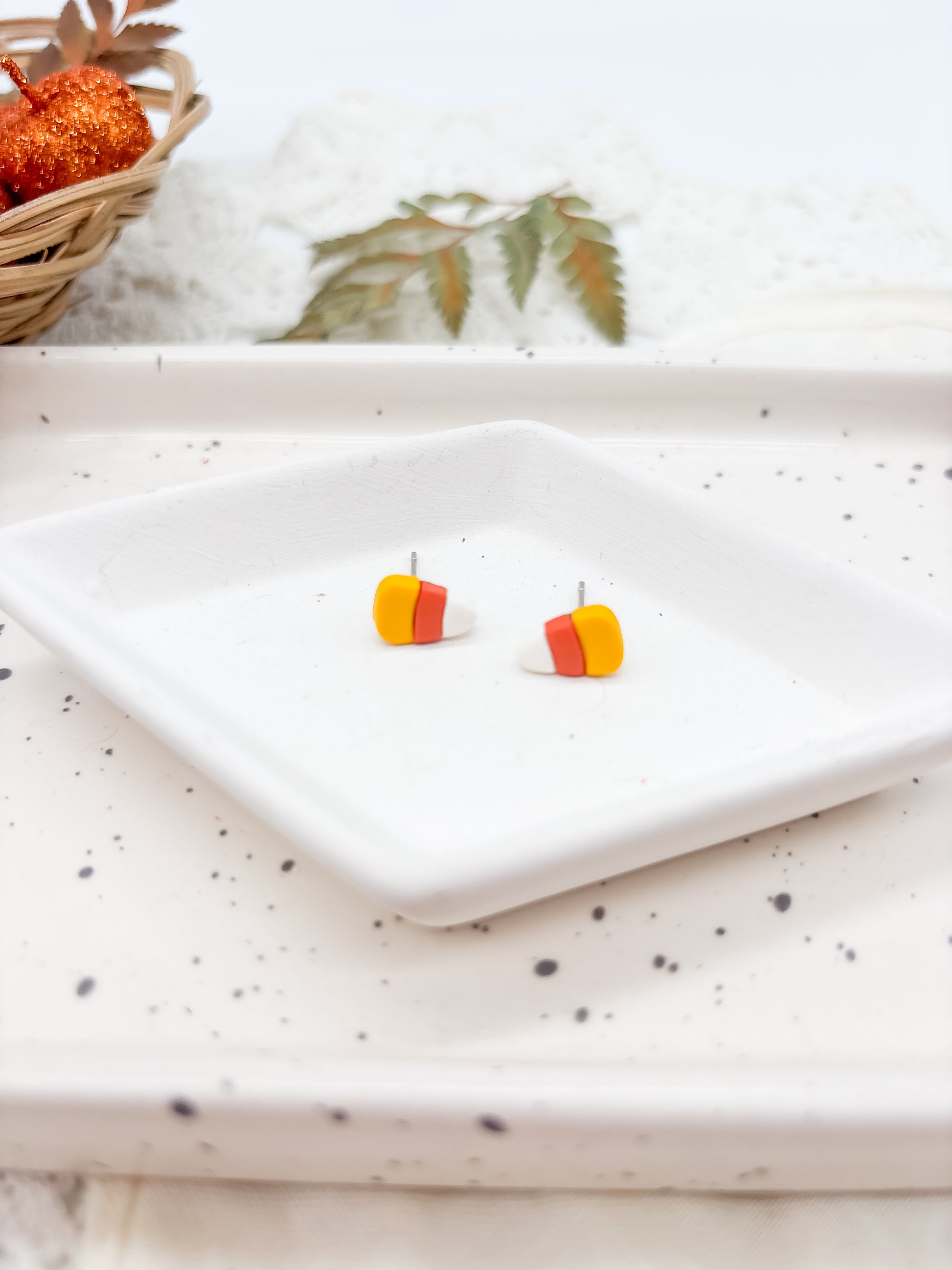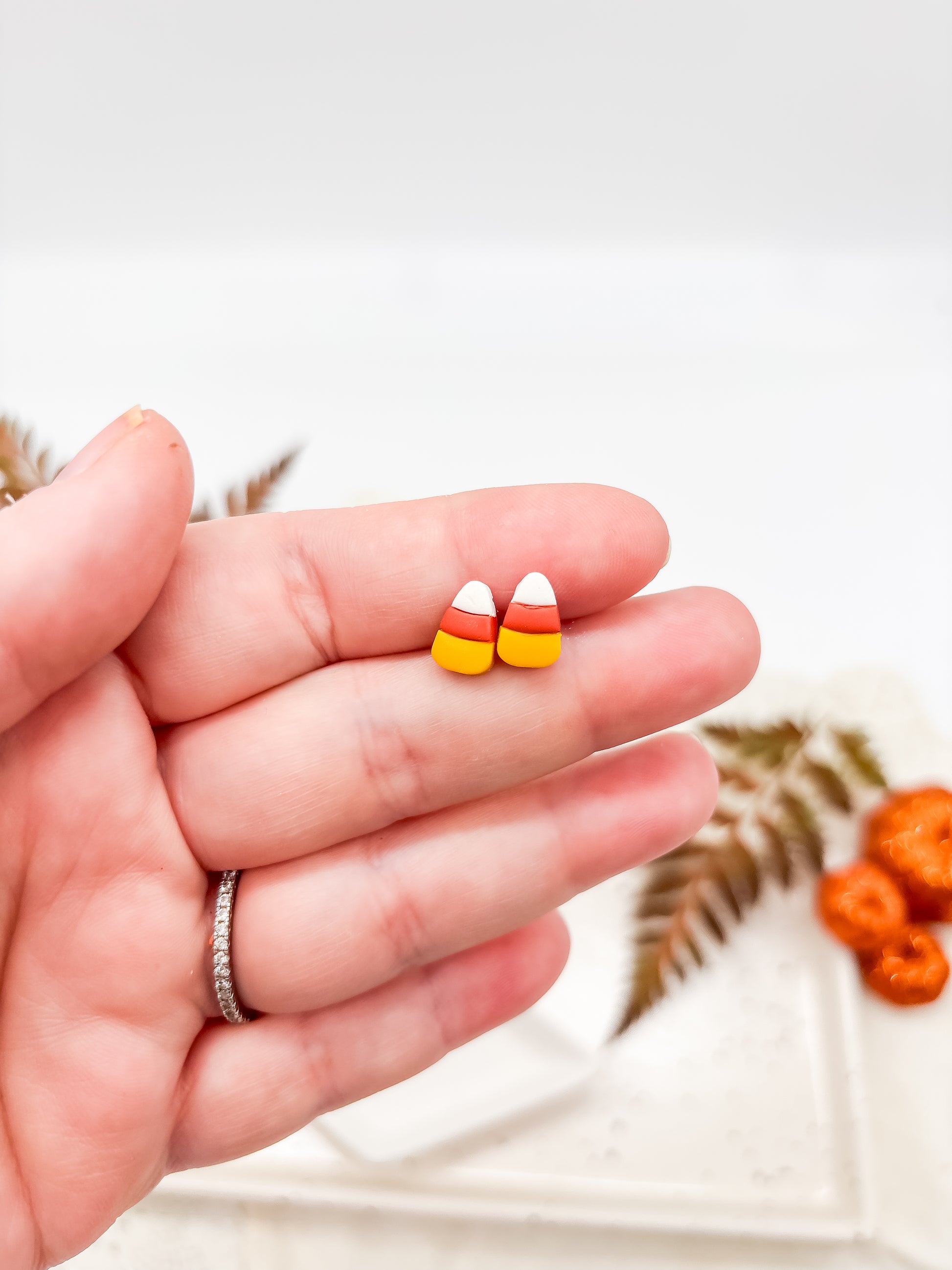 These polymer clay candy corn studs offer a playful nod to the season with their classic tri-color design. Mounted on stainless steel posts, they ensure comfortable, long-lasting wear. Perfect for adding a subtle festive touch to any outfit with a cute and refined style.