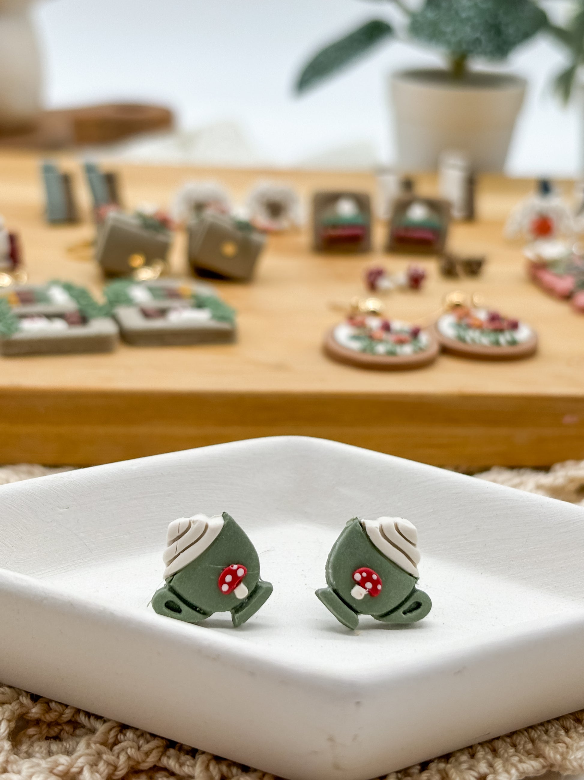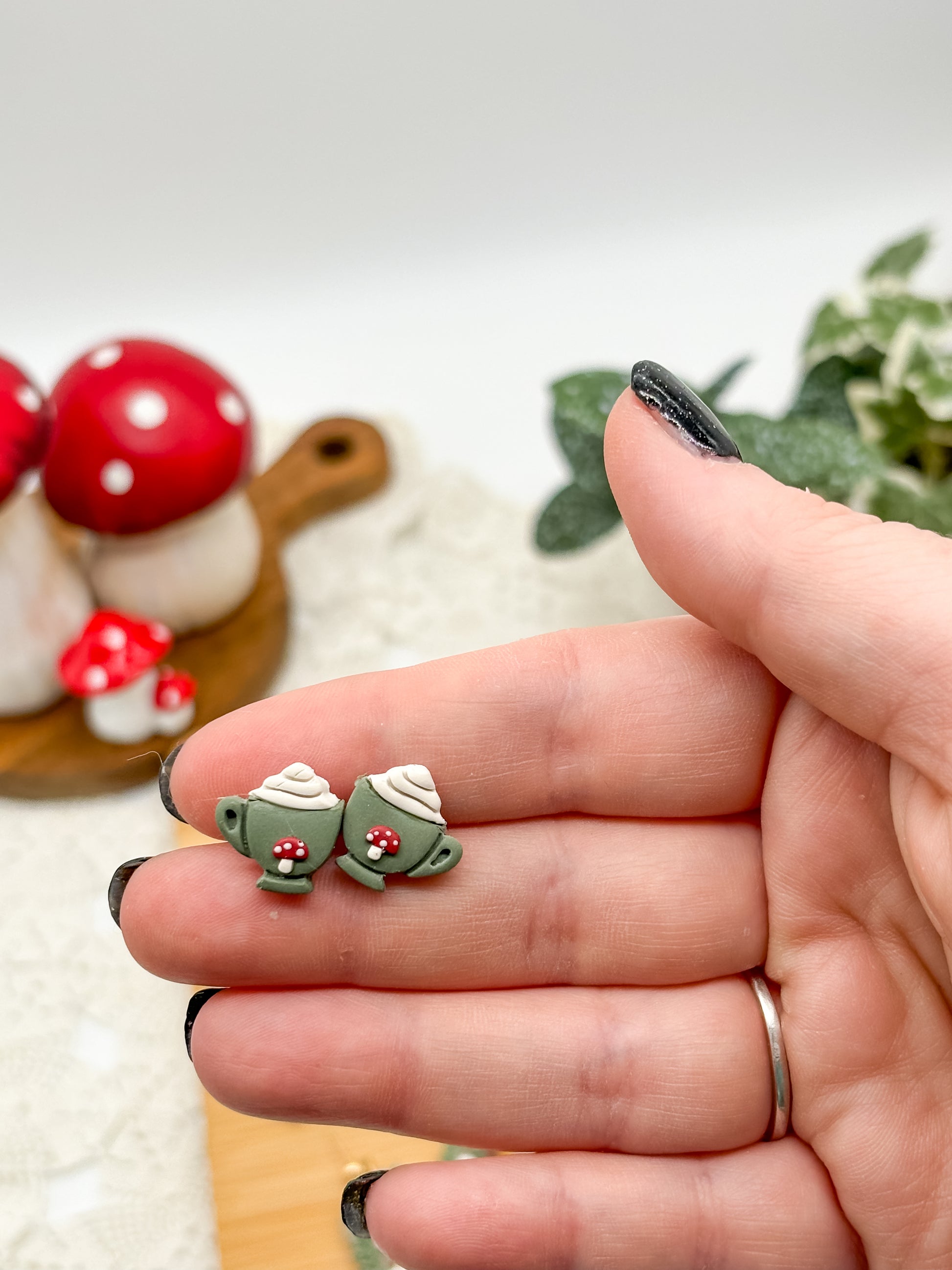 Introducing our cute, handcrafted Cozy Coffee Mugs! Made with green polymer clay, each mug features a charming little red mushroom for an added touch. Stay cozy with our Cozy Coffee Mugs!