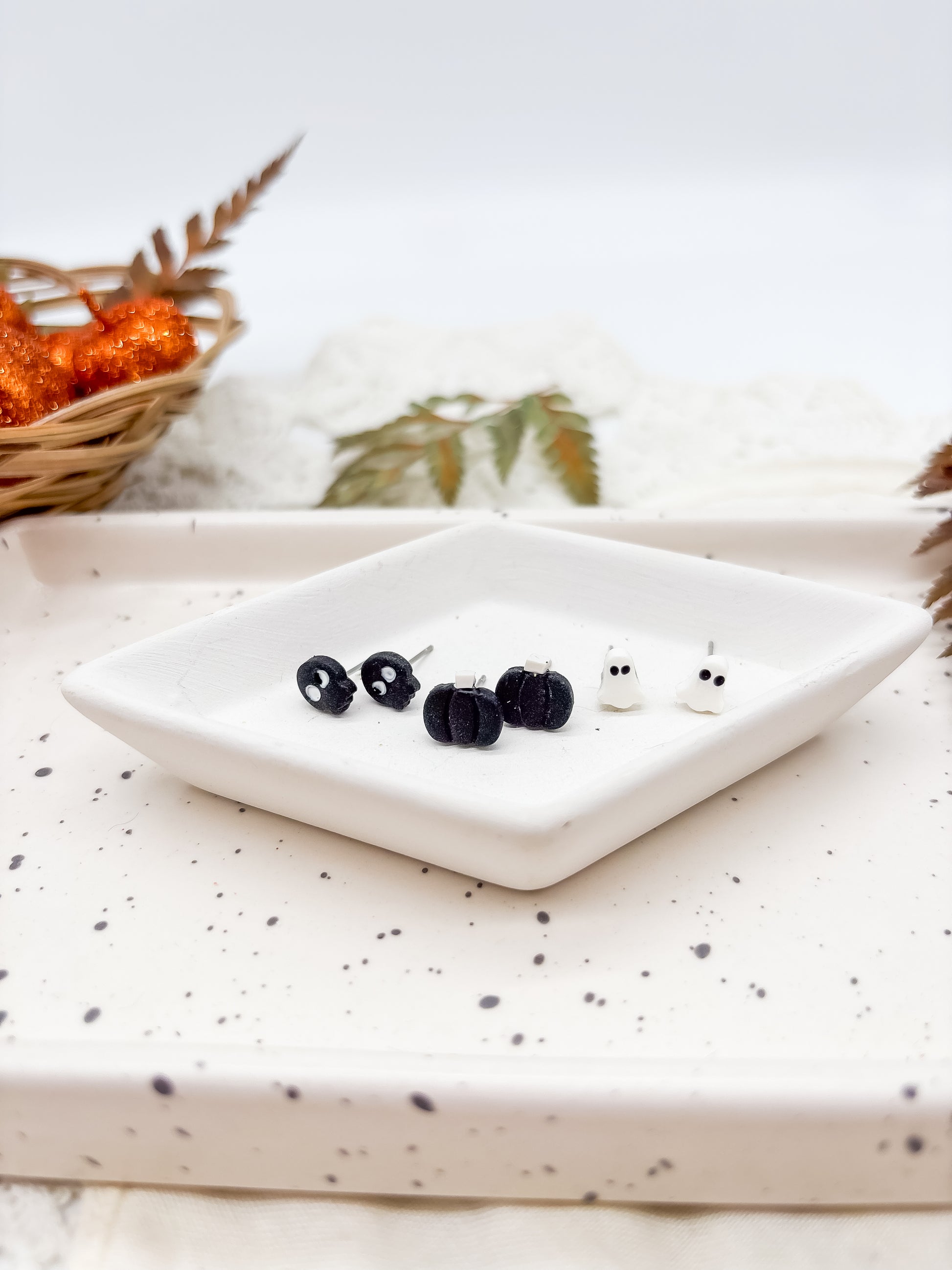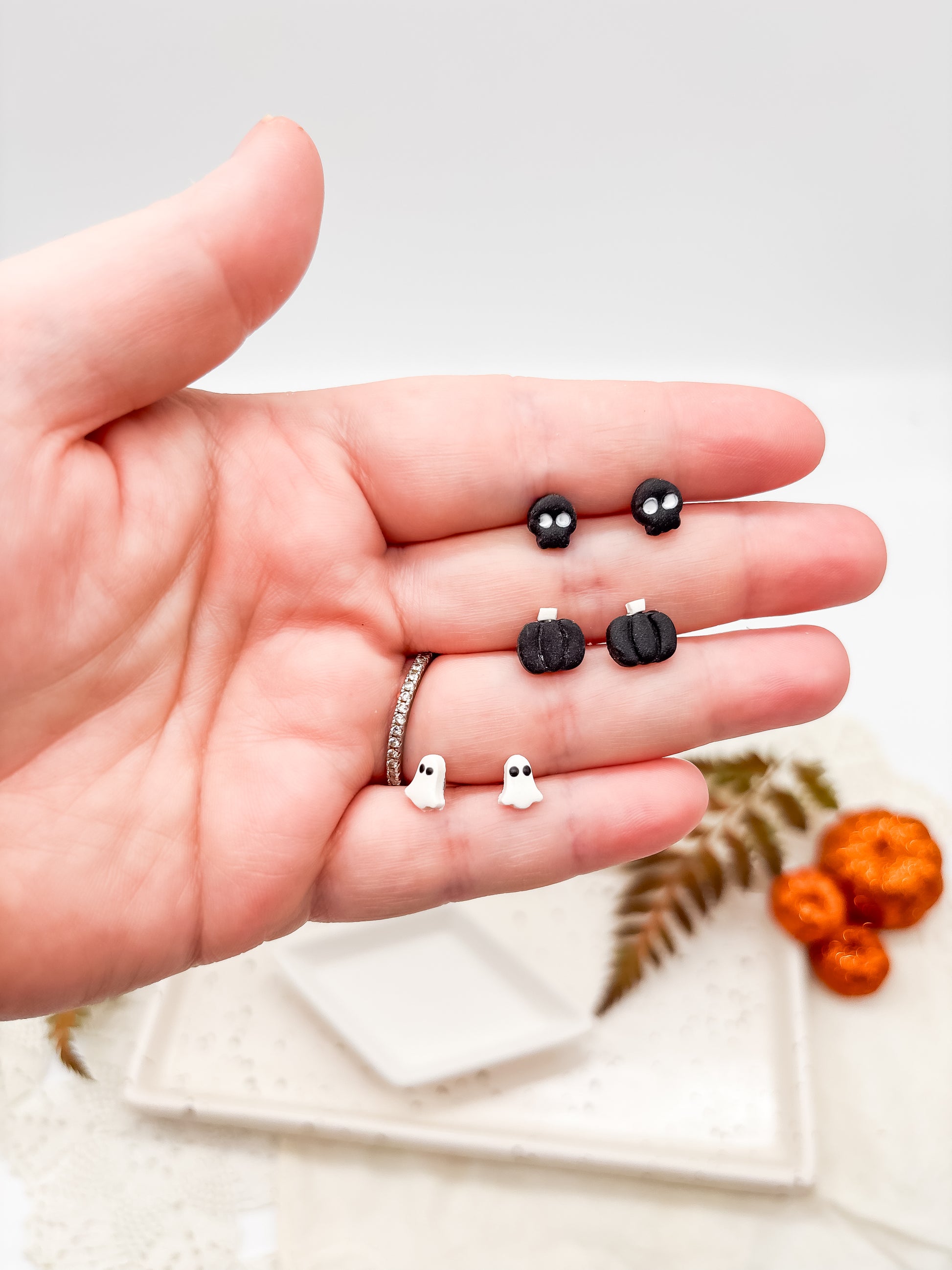 This Dark Tiny Stud Pack includes three handcrafted polymer clay earrings: a ghost, a black pumpkin, and a black skull. Perfect for adding a subtle spooky touch to your everyday look, these lightweight studs combine charm with a hint of Halloween spirit. Each piece is carefully made for durability and comfort, making them ideal for anyone who loves cute, understated accessories with personality.