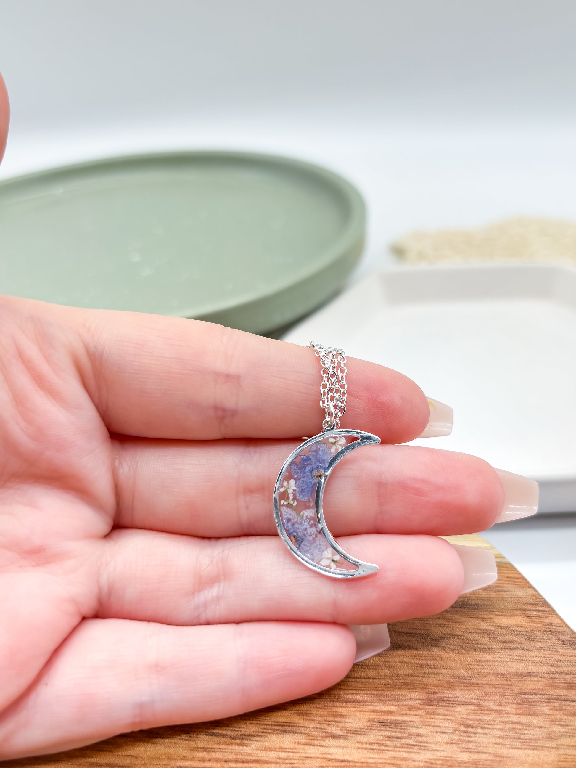 Embrace the beauty of the night sky with our delicate moon necklace. Available in both silver and gold plated options, it features a delicate moon pendant adorned with tiny blue forget me not flowers. Perfect for adding a touch of whimsy to any outfit.