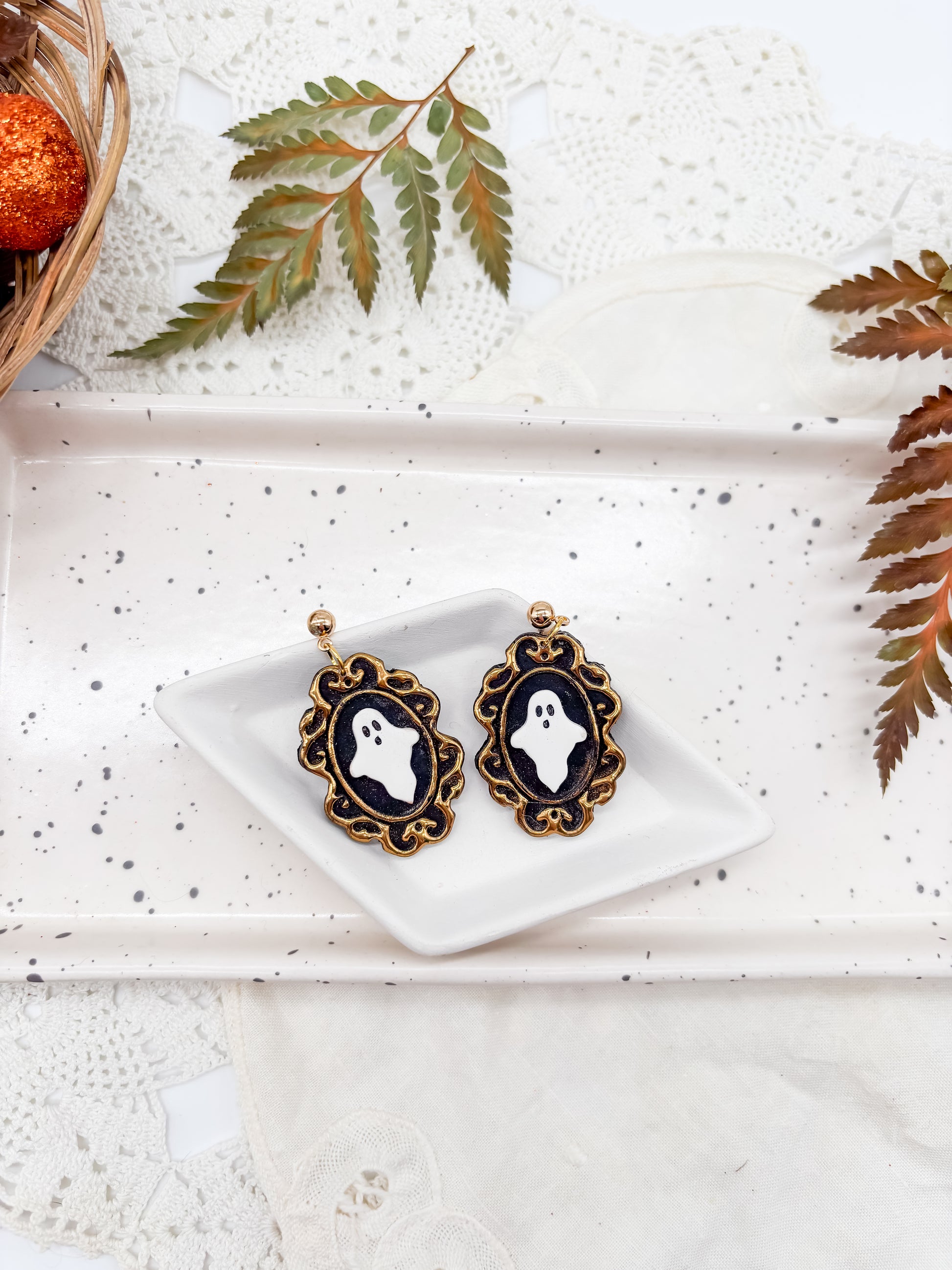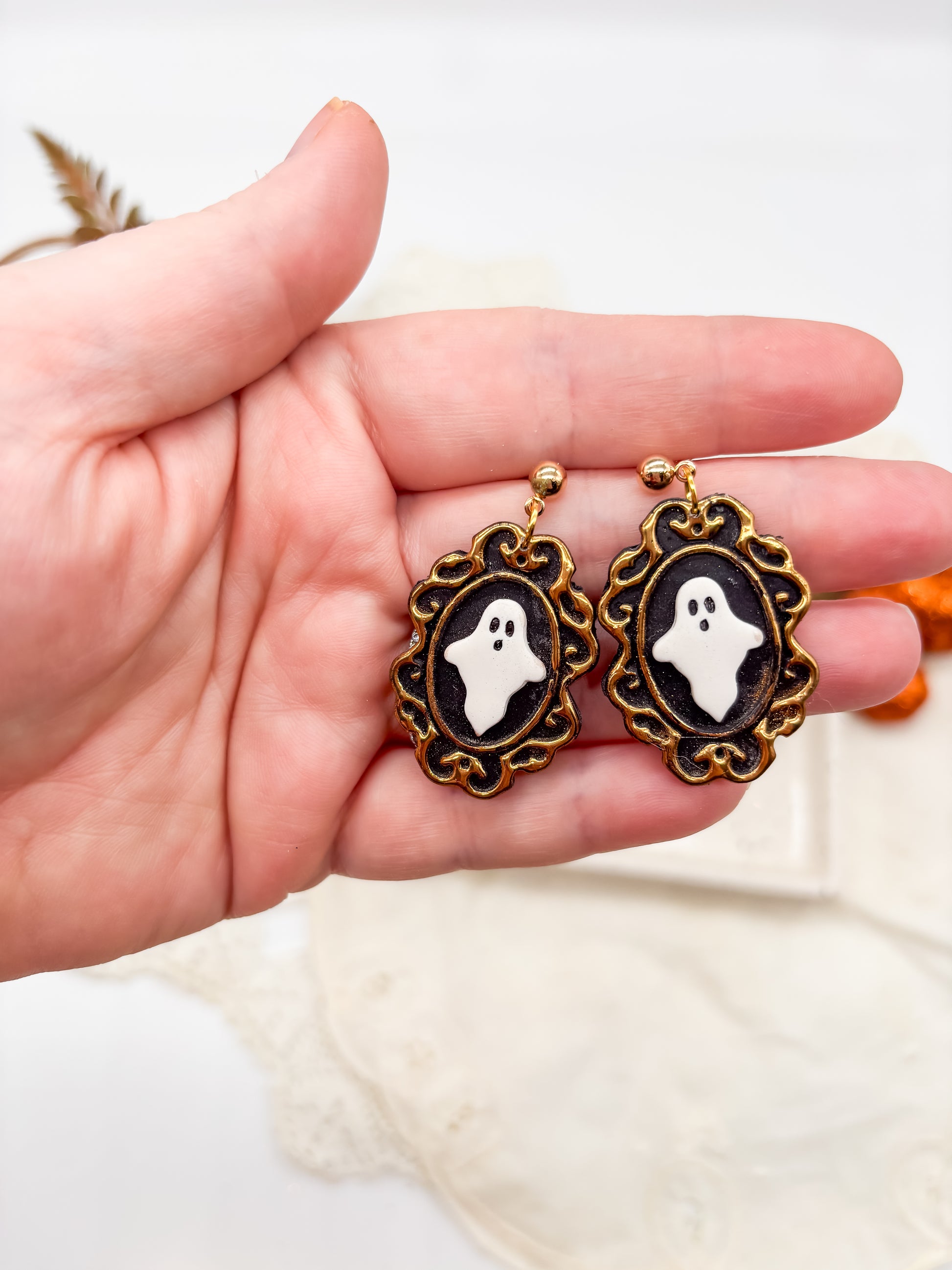 These charming polymer clay earrings feature delicate ghost designs set within vintage-style gold frames on a contrasting black clay background. The earrings are also available with silver frames, offering versatile style options that blend whimsy with classic elegance. Perfect for expressing a fun, mysterious vibe with a refined finish.