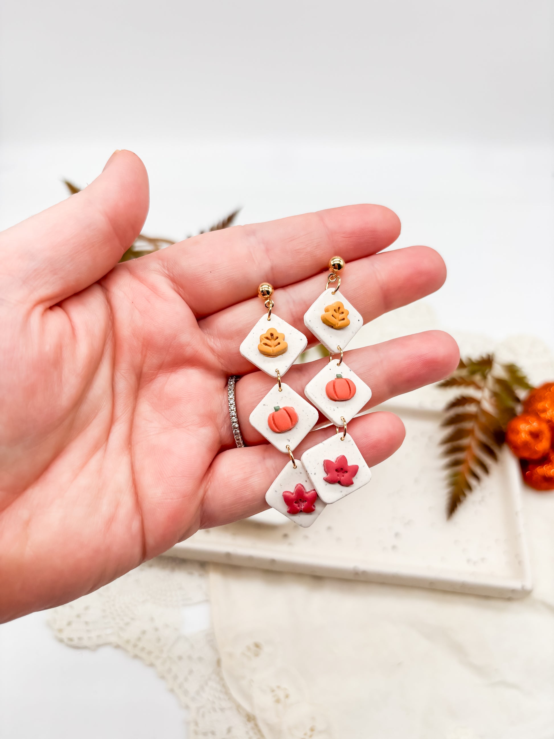 Celebrate the colors of fall with these polymer clay dangle earrings featuring three cream colored speckled and decorated squares: a red leaf, a yellow leaf, and a pumpkin. Finished with silver or gold-plated ball posts, they offer a comfortable and stylish way to embrace autumn’s warm, natural beauty in your everyday wardrobe.