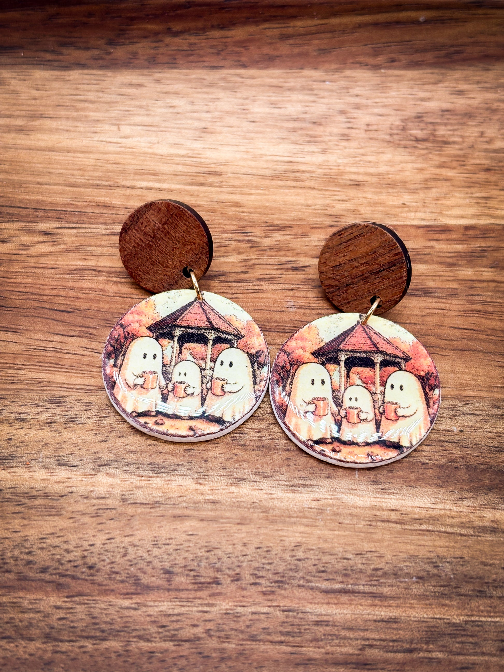 These handmade polymer clay dangle earrings showcase adorable ghosts enjoying coffee while relaxing in a gazebo with wood posts. Each pair captures a whimsical, cozy scene that adds a playful and charming accent to your look, perfect for those who love unique, story-rich accessories.
