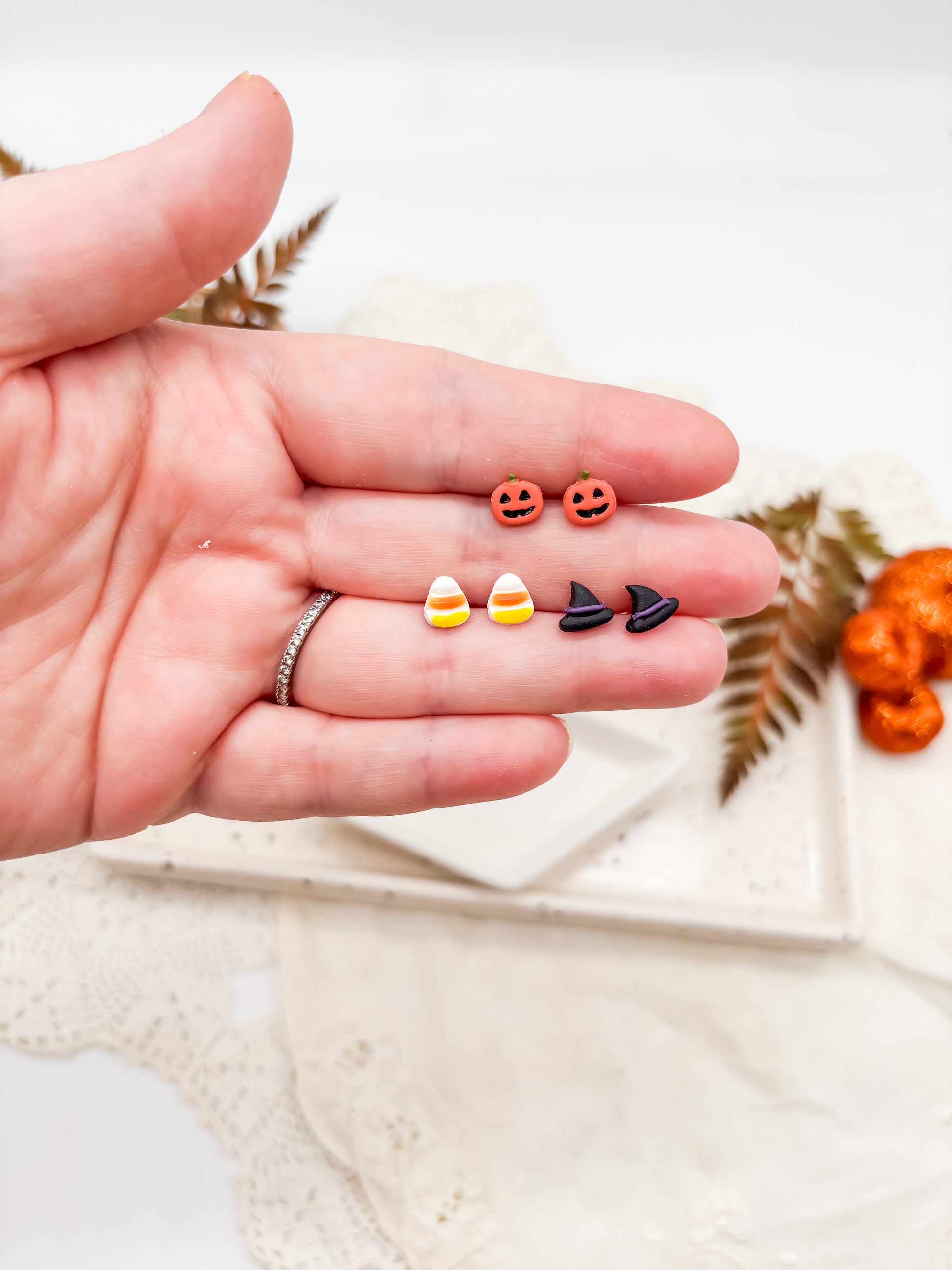 Candy corn, witch hat, and jack-o-lantern tiny stud pack