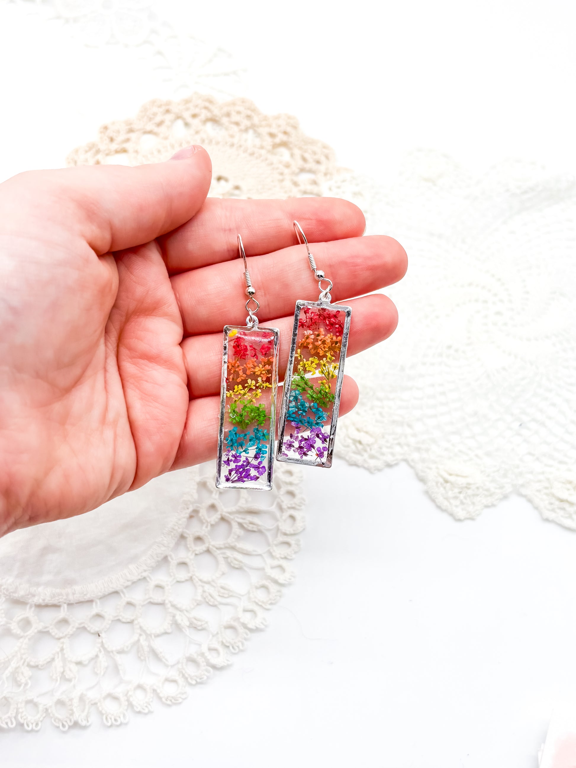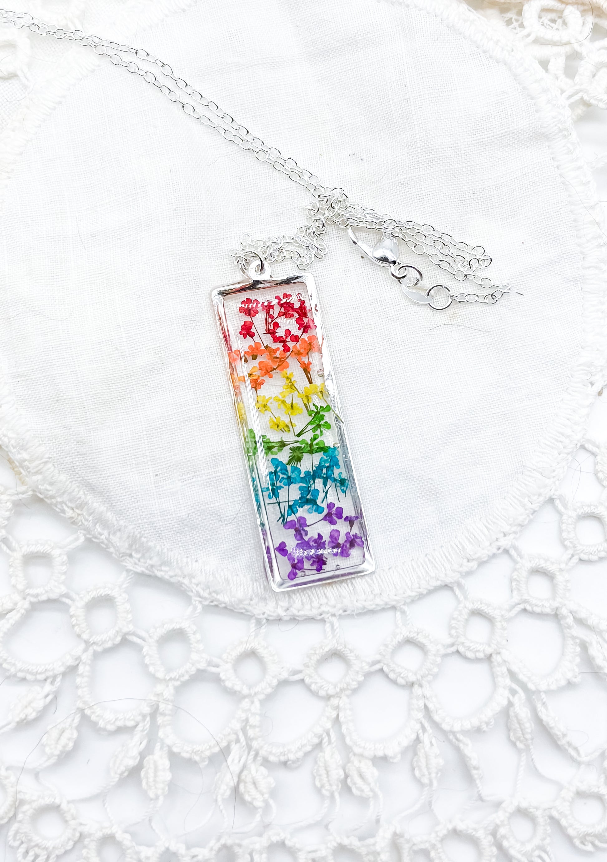 Dress up in cute and unique style with our silver plated bar necklace or earrings. Each piece features real pressed flowers in a beautiful rainbow of colors, making it a charming accessory to any outfit. Stand out with this exclusive and charming necklace. Necklace comes on an 18 inch plated chain.