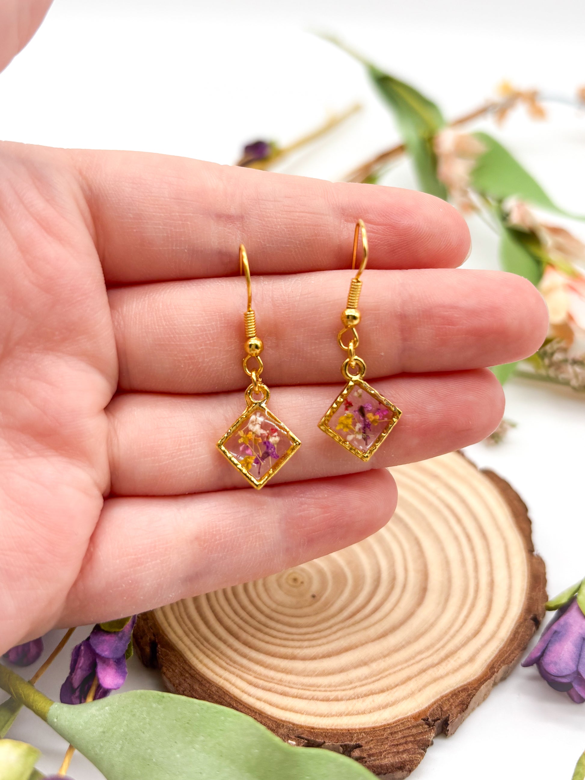 Gold tiny diamond shaped dangles with colorful pressed flowers