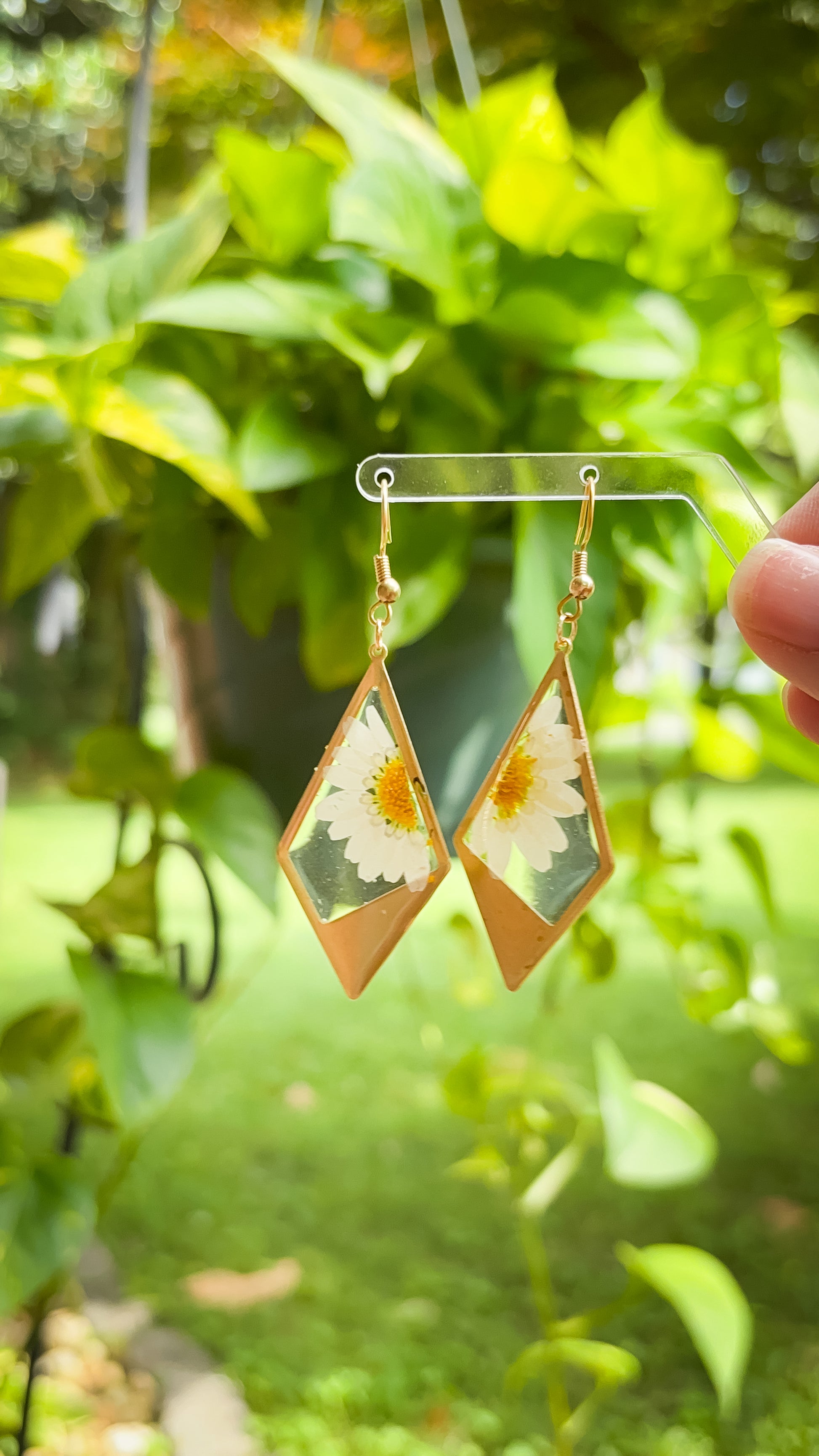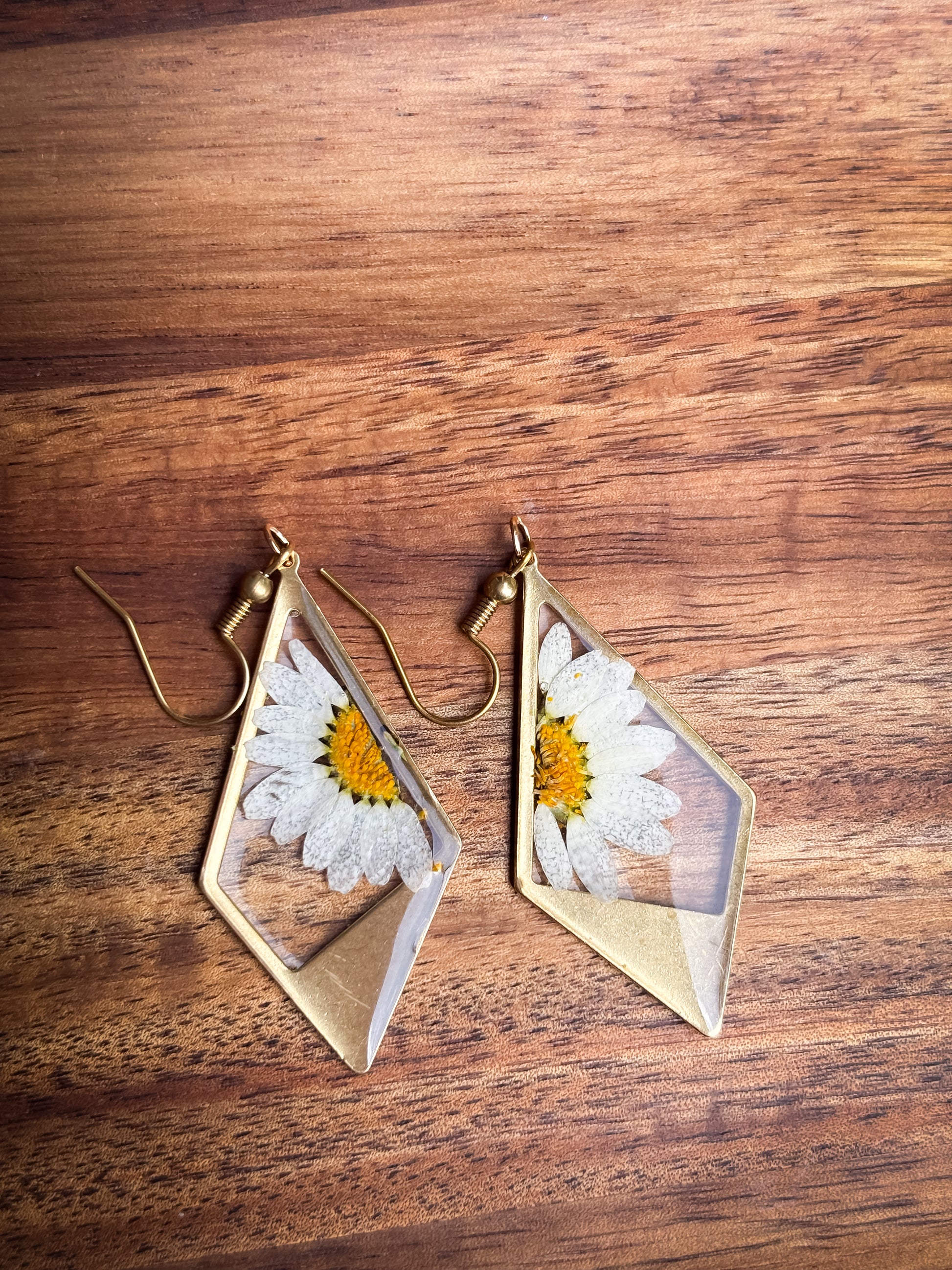 Delight in the charm of real pressed daisy flowers, beautifully encased in gold toned diamond shaped bezels. These delicate daisy hang gracefully from gold plated French hooks, combining natural elegance with refined craftsmanship. Perfect for adding a subtle, nature-inspired touch to any outfit.