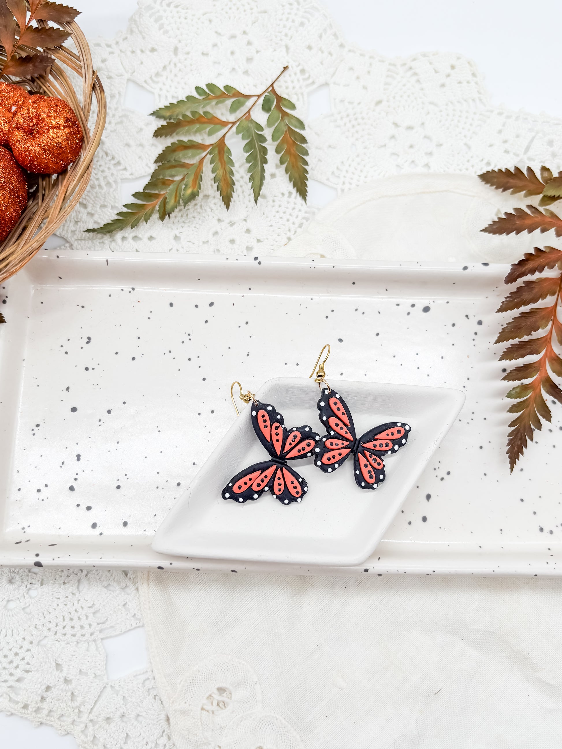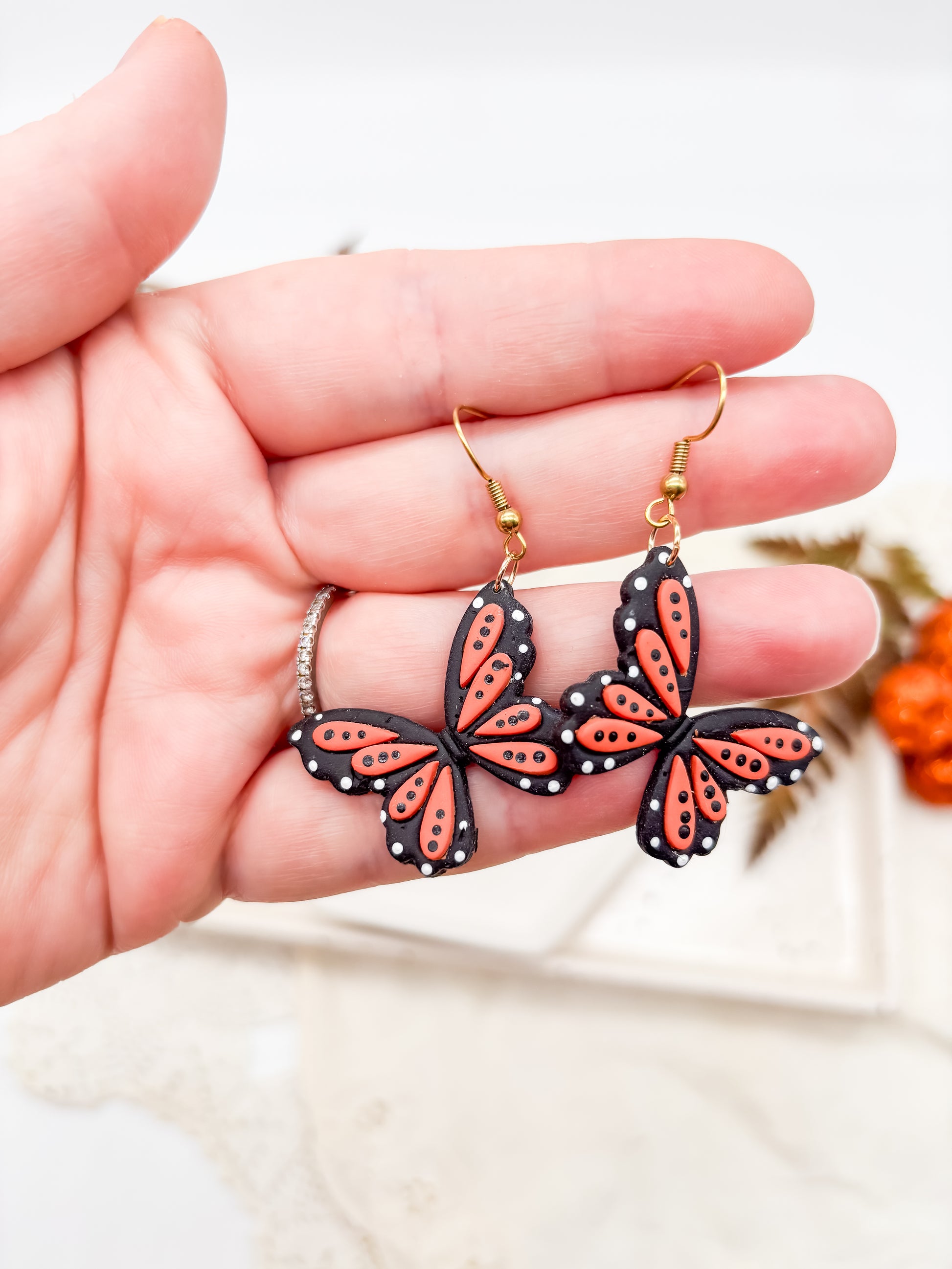 Delight in the beauty of nature with these polymer clay Monarch dangle earrings, showcasing detailed butterfly designs. Available with either silver or gold-plated hooks, they offer a lightweight and elegant accessory to brighten your ensemble. Perfect for those who appreciate delicate craftsmanship and a touch of natural charm in their jewelry collection.