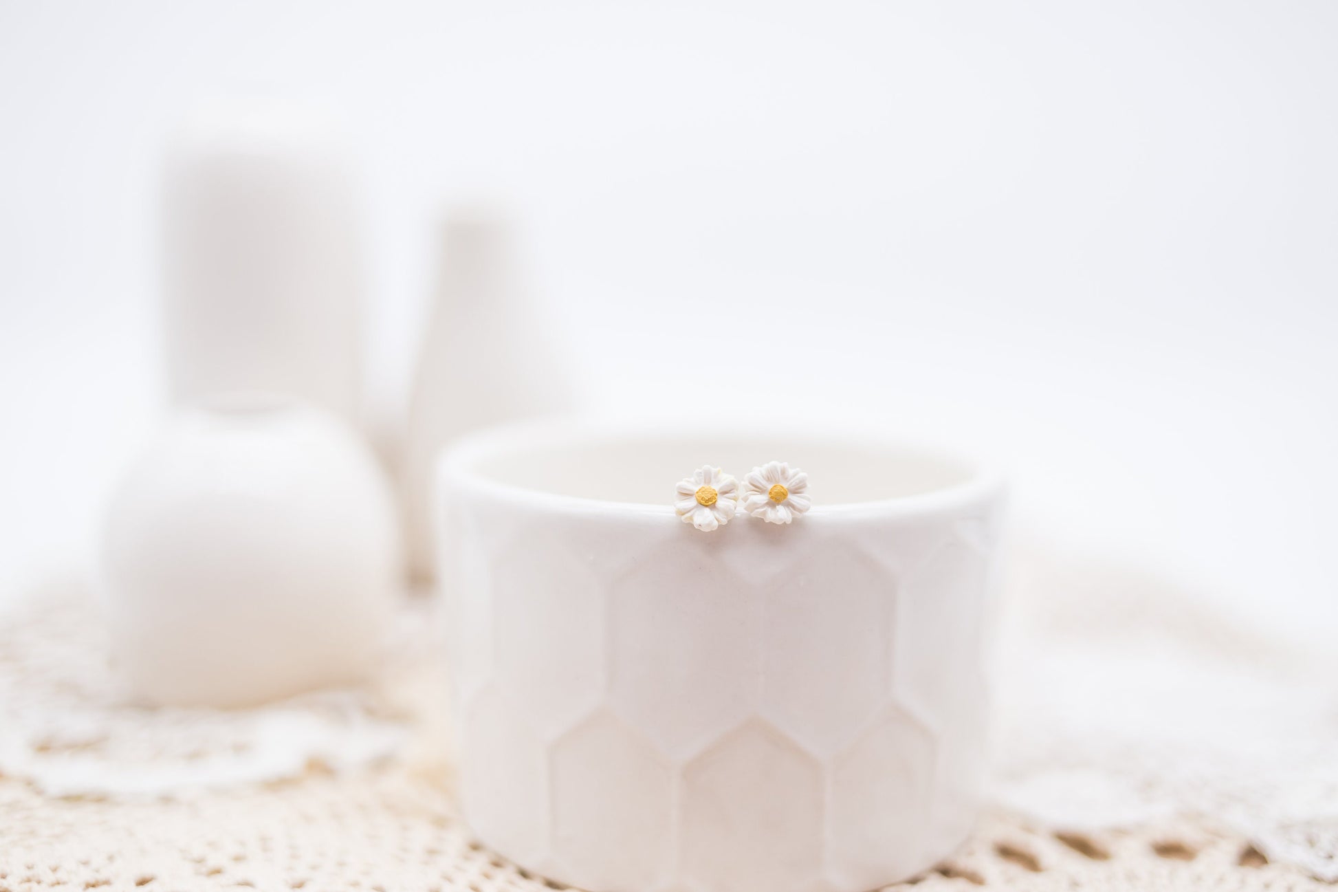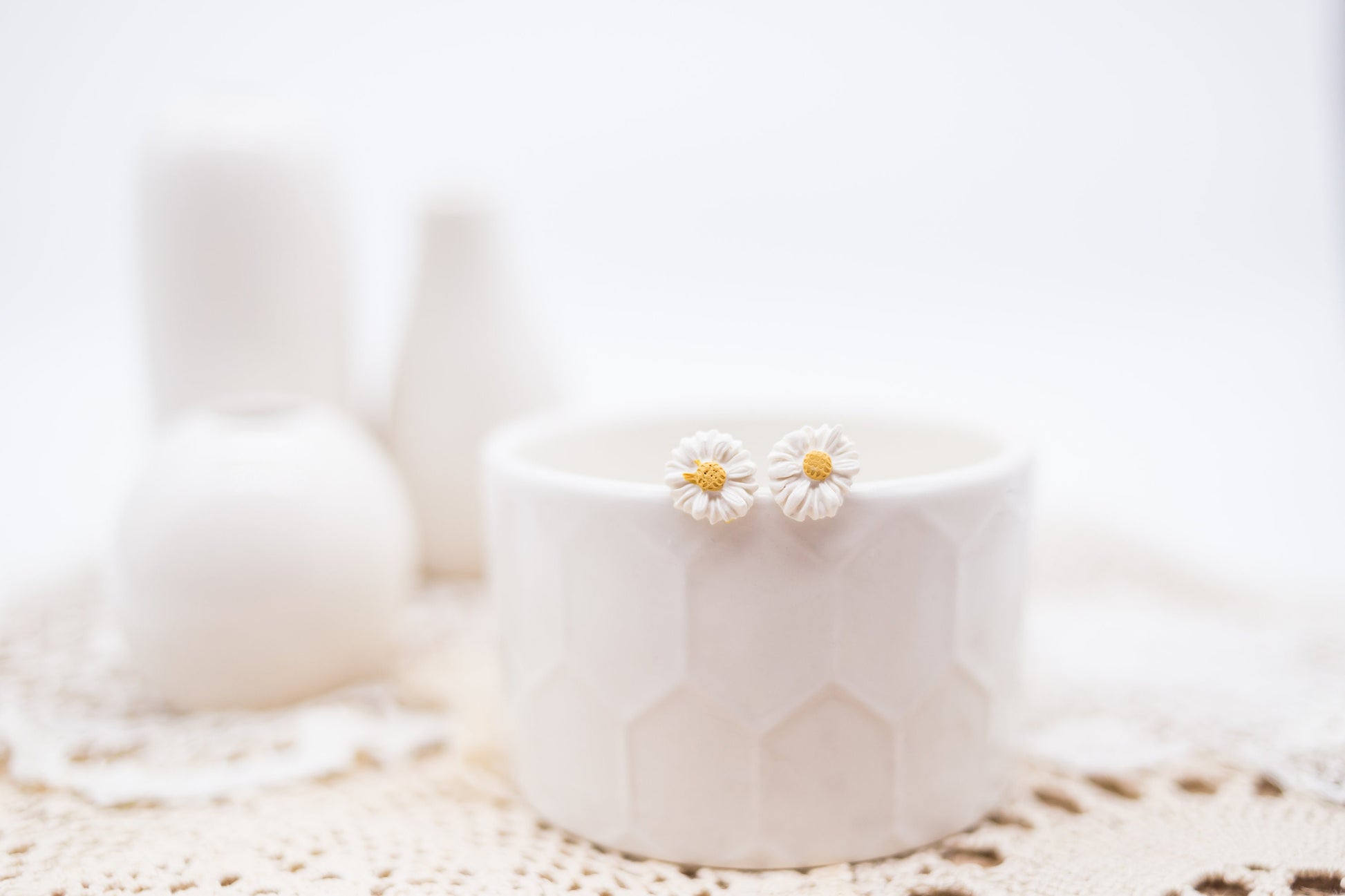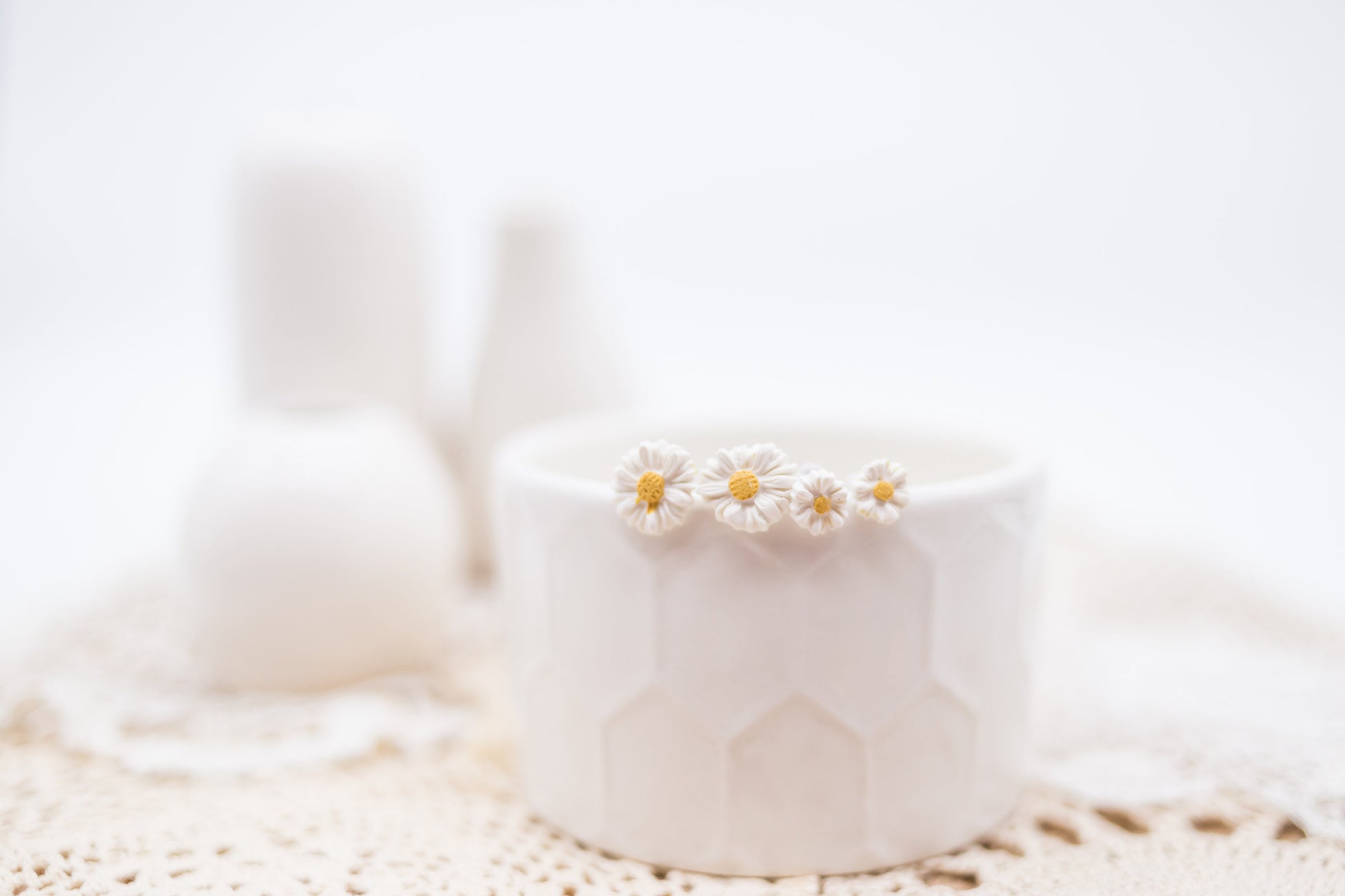 These white daisy stud earrings made out of polymer clay are a charming and delightful accessory that will add a touch of freshness and natural beauty to your style.