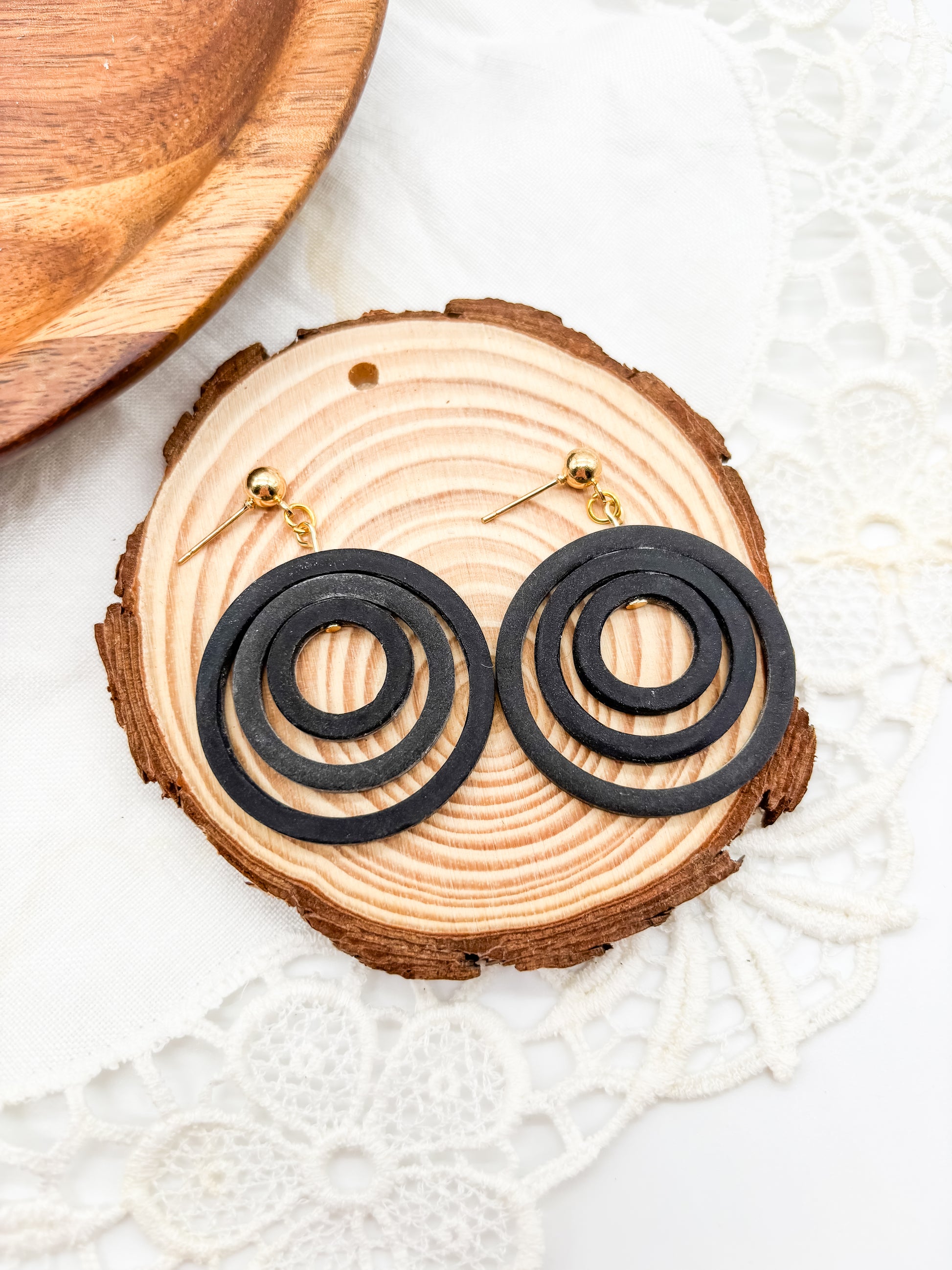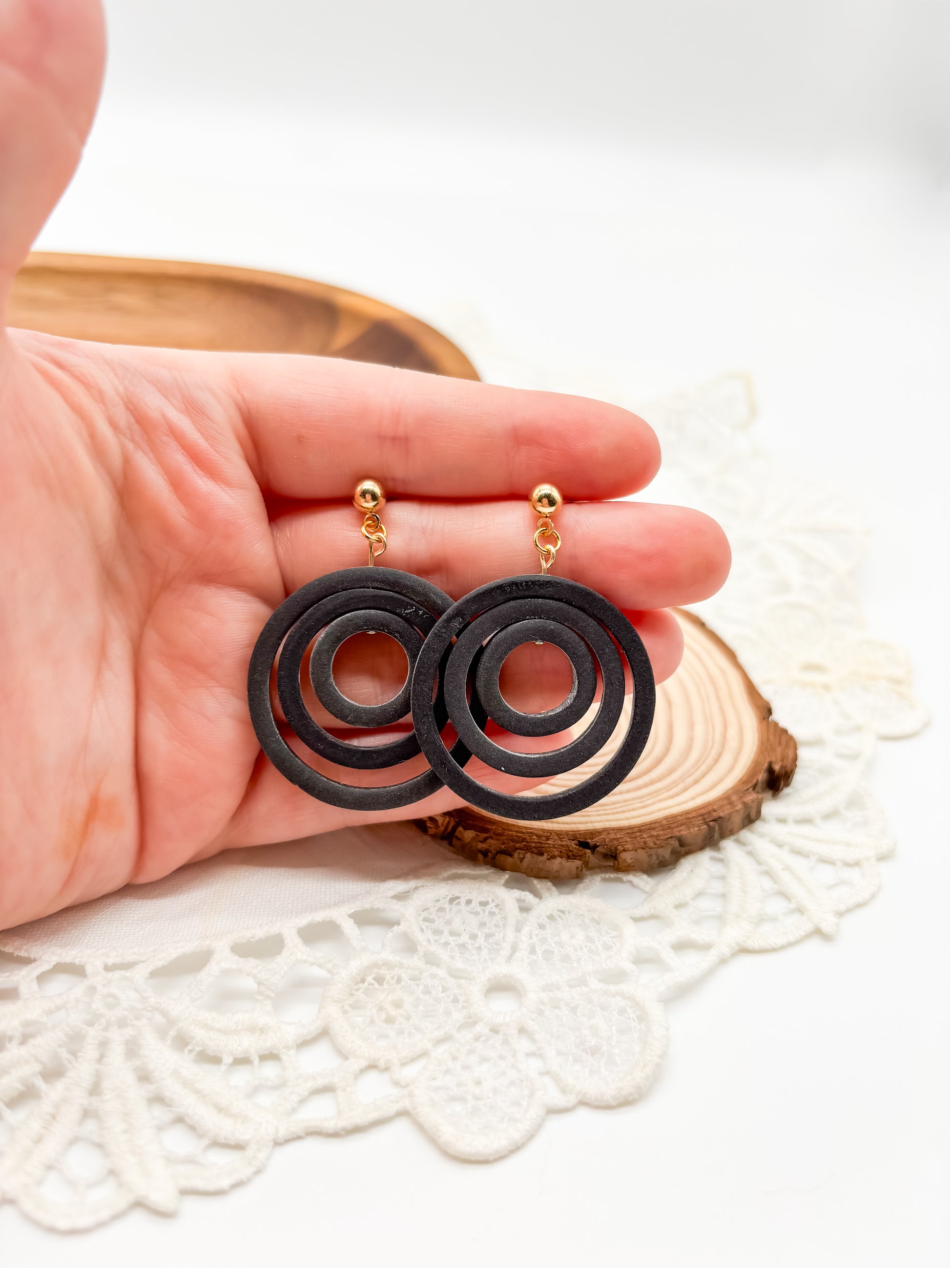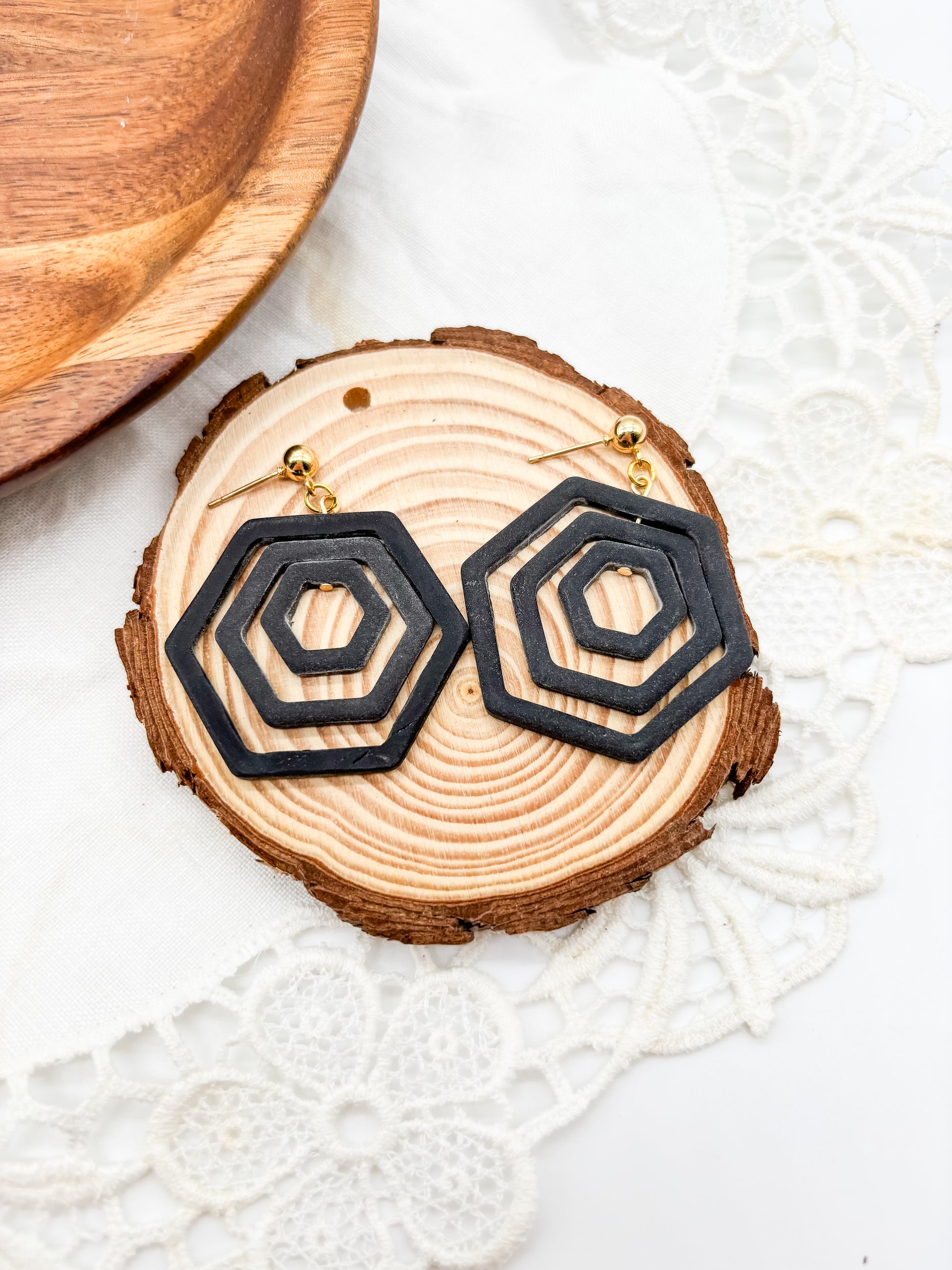 Effortlessly spin your stress away with our cute Hexagon Spinners in black. Made of three sizes of polymer clay hexagons, these spinners provide a fun and whimsical look to any outfit.