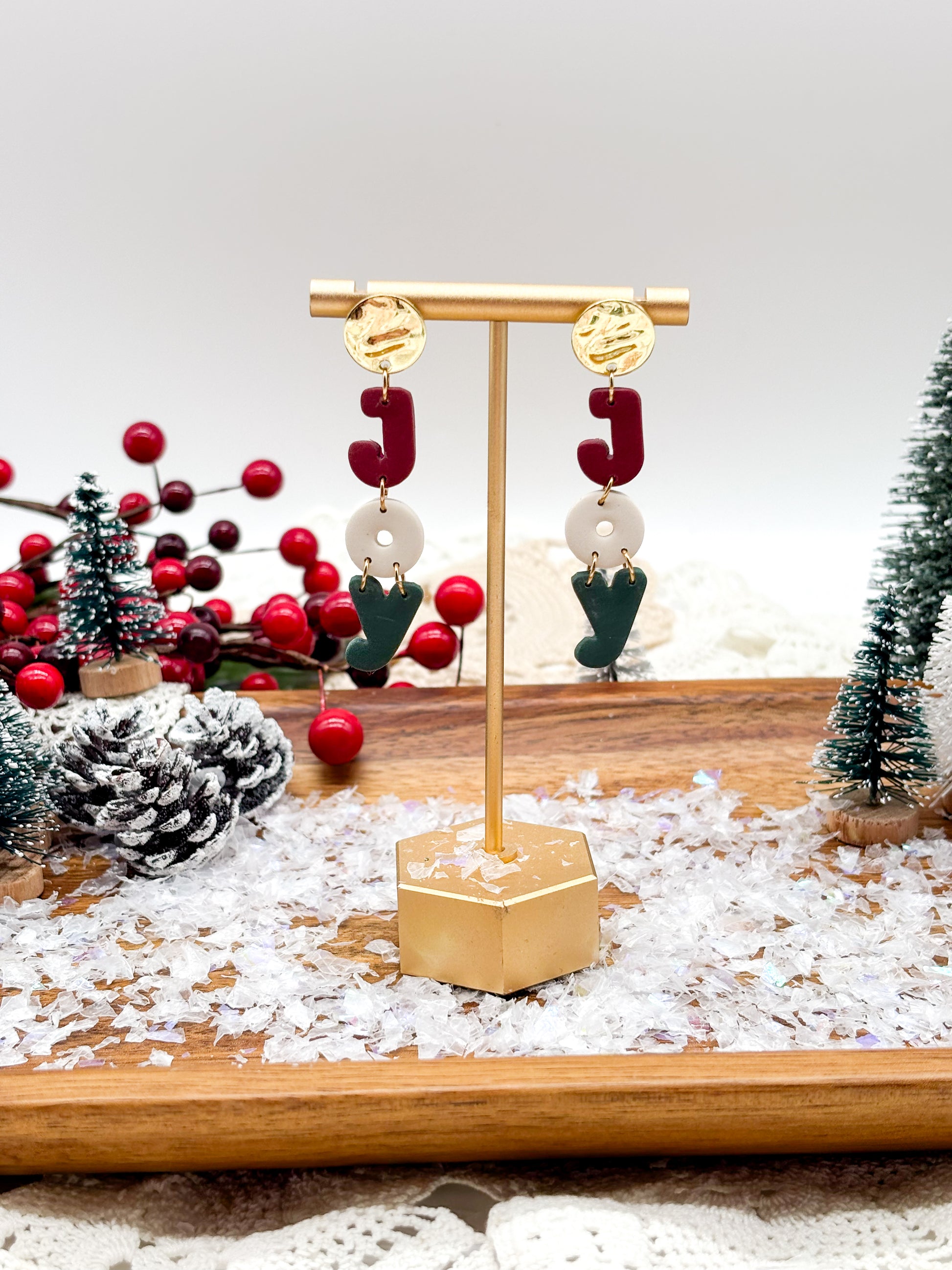 Handcrafted polymer clay earrings featuring festive "JOY" designs. Each pair sits on elegant gold circle posts, offering a lightweight wear that's perfect for holiday gatherings or year-round candy-inspired style. These artisan-made earrings combine playful charm with quality craftsmanship, making them an ideal gift for anyone who loves whimsical, wearable art.