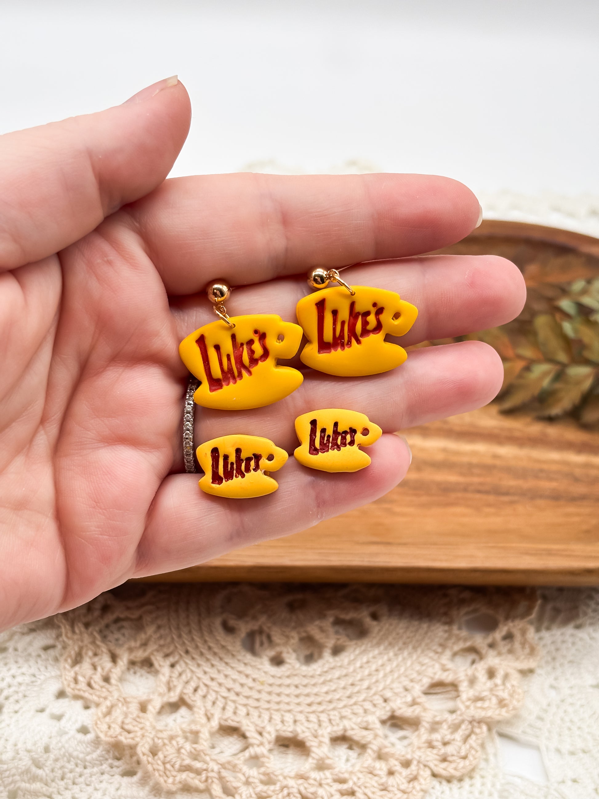Celebrate your love for cozy moments with these handmade yellow coffee mug earrings inspired by Luke's Diner. Crafted from polymer clay, each earring features a charming mug design complete with the iconic "Luke's" logo. Available in both dangle and stud styles, they offer a playful yet stylish way to express your fandom. Lightweight and durable, these earrings are perfect for adding a touch of warmth and personality to any outfit.