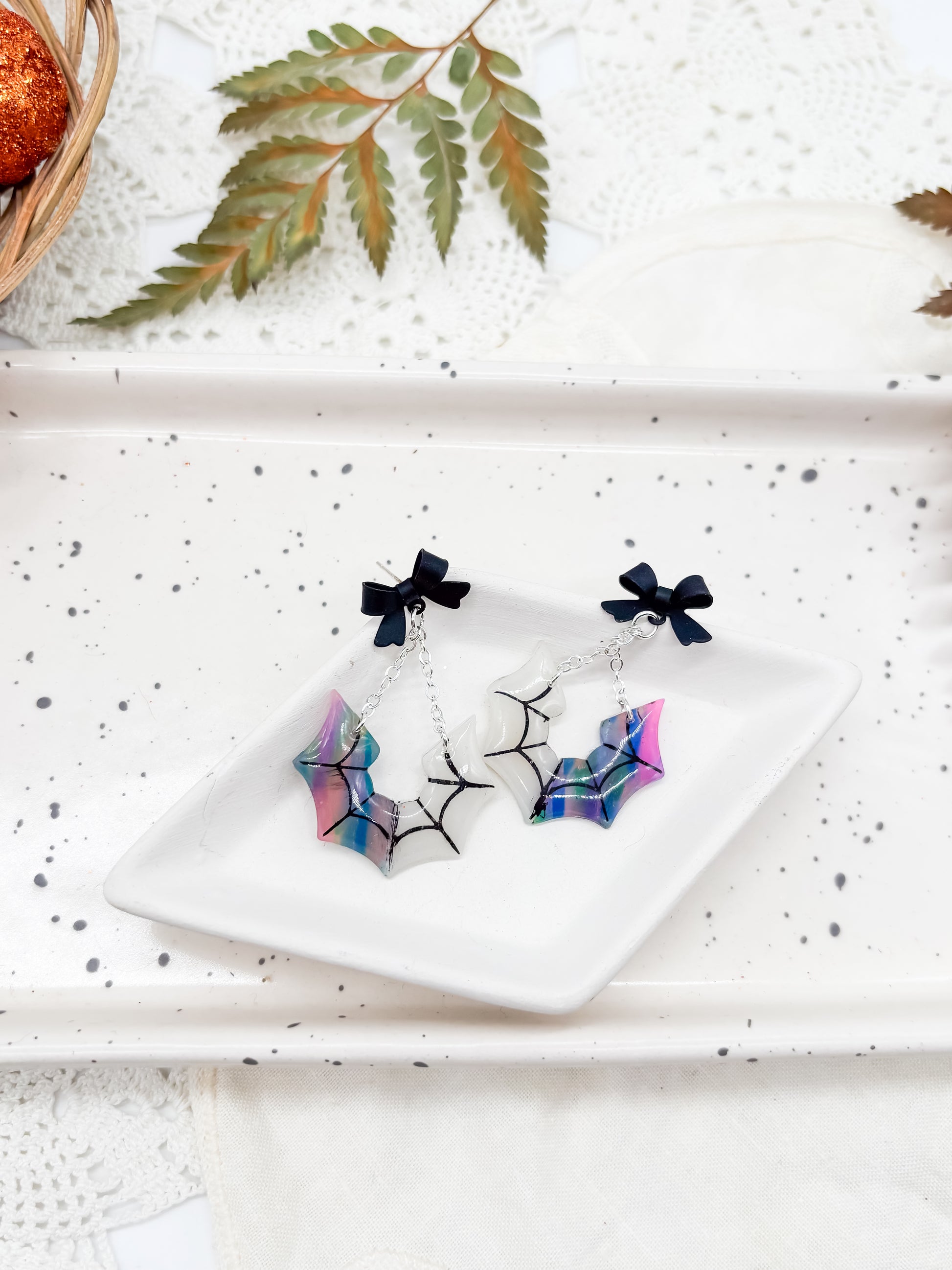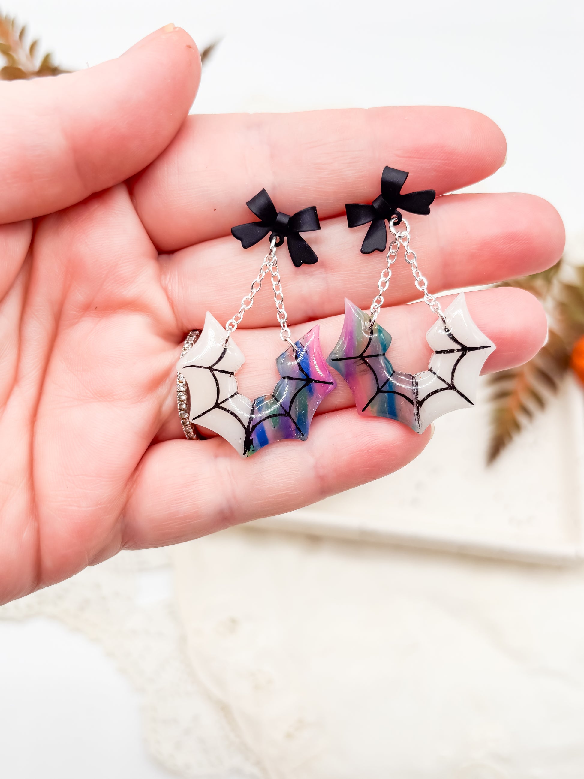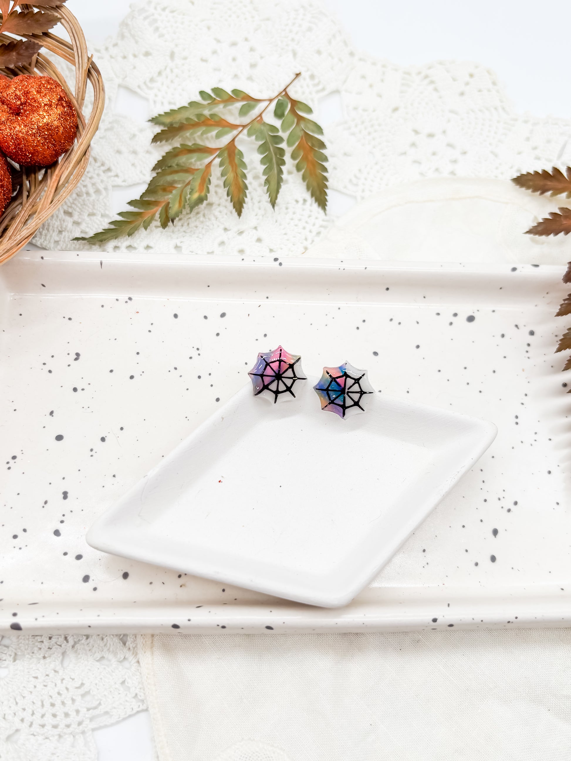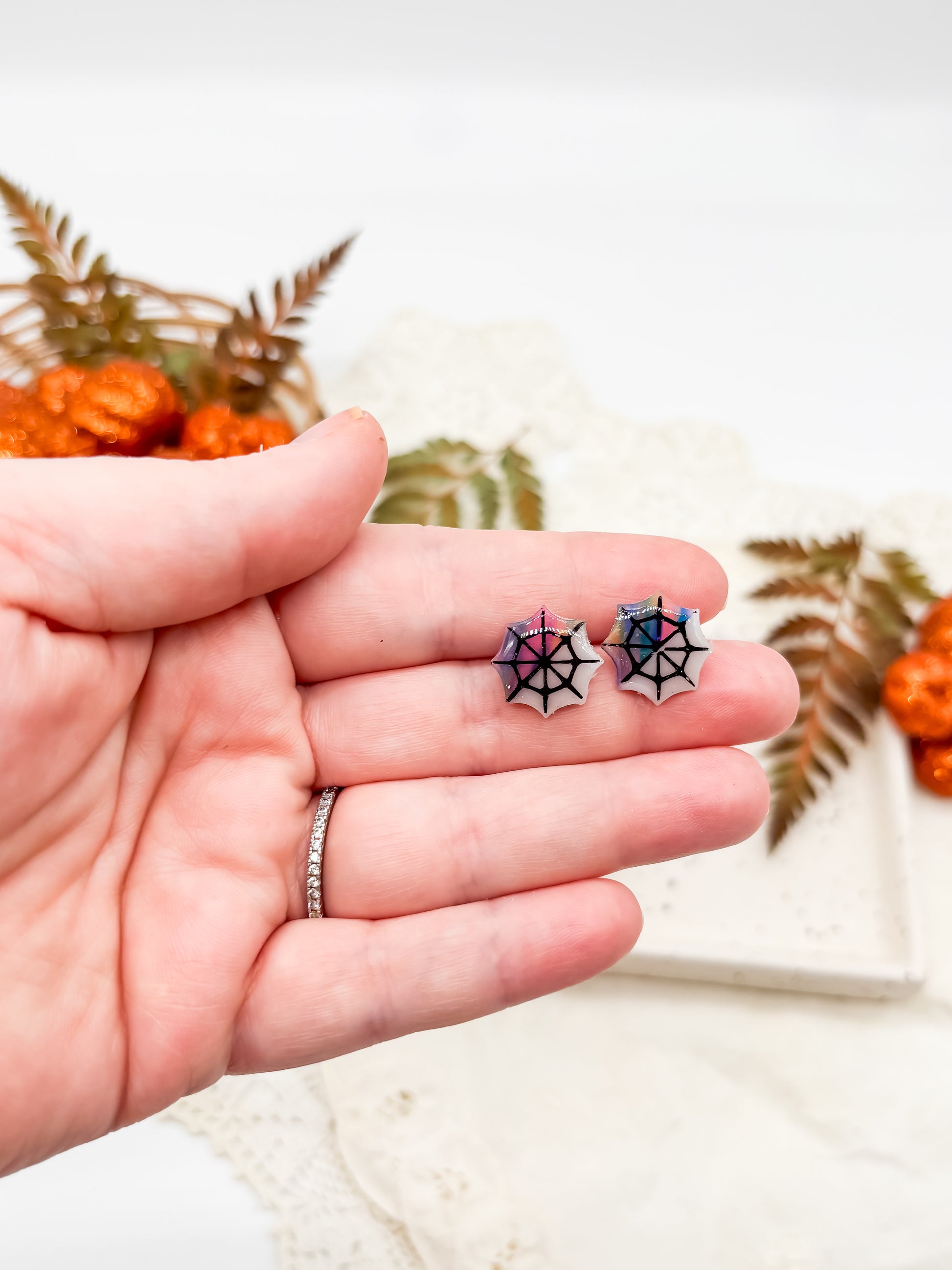Inspired by the intricate beauty of two-part stained glass, these polymer clay earrings feature delicate spiderweb designs in both dangle and stud styles. The lightweight pieces offer a subtle nod to gothic elegance, perfect for adding a unique and sophisticated touch to your look with a playful edge.
