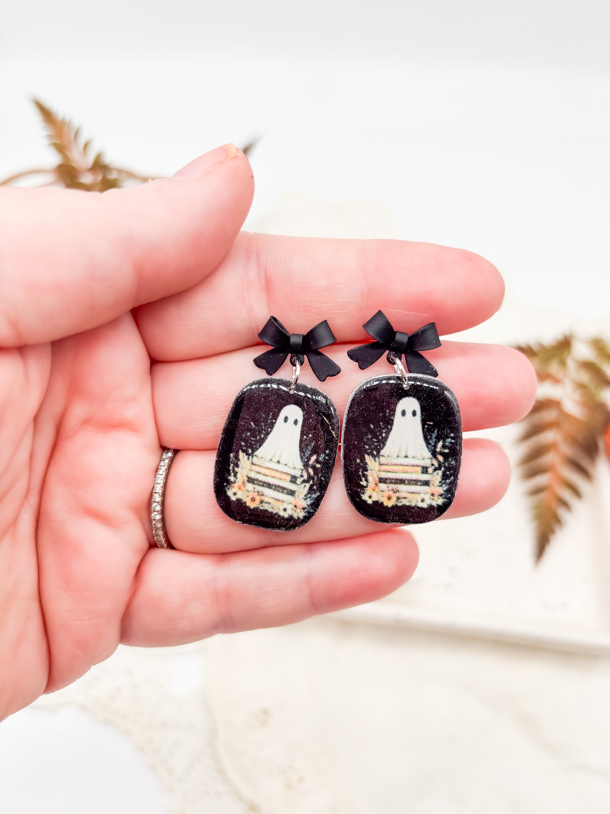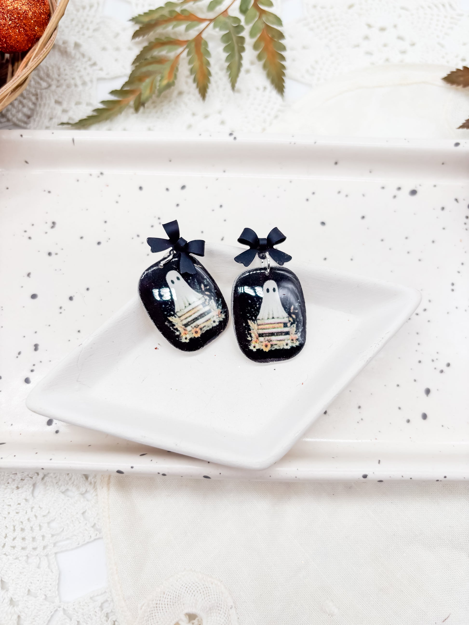 These vintage boho-style polymer clay dangle earrings feature whimsical ghosties standing on stacks of books, accented with black bow posts edged in silver or gold. Lightweight and charming, they add a subtle touch of nostalgic elegance and playful personality to any outfit.