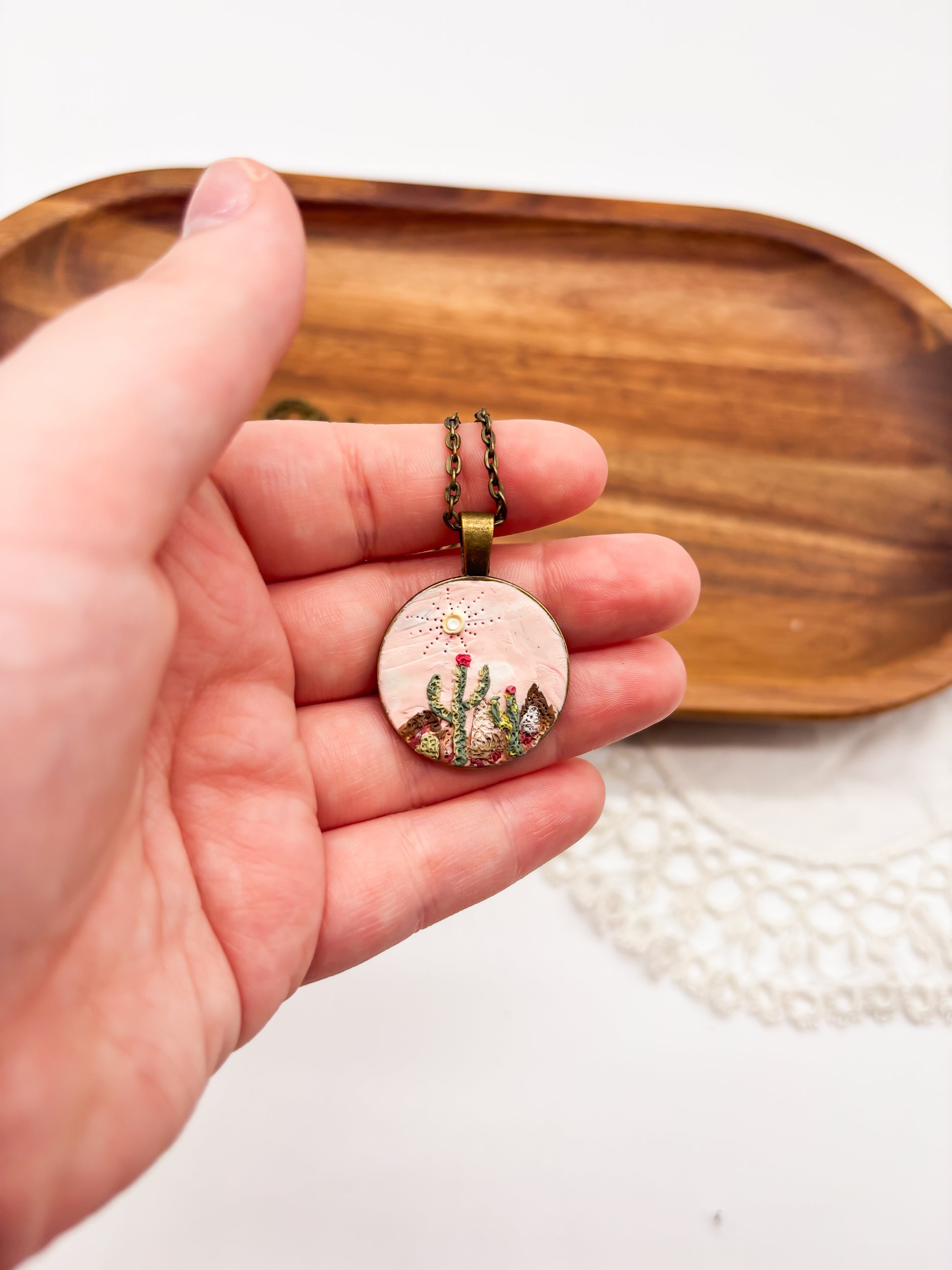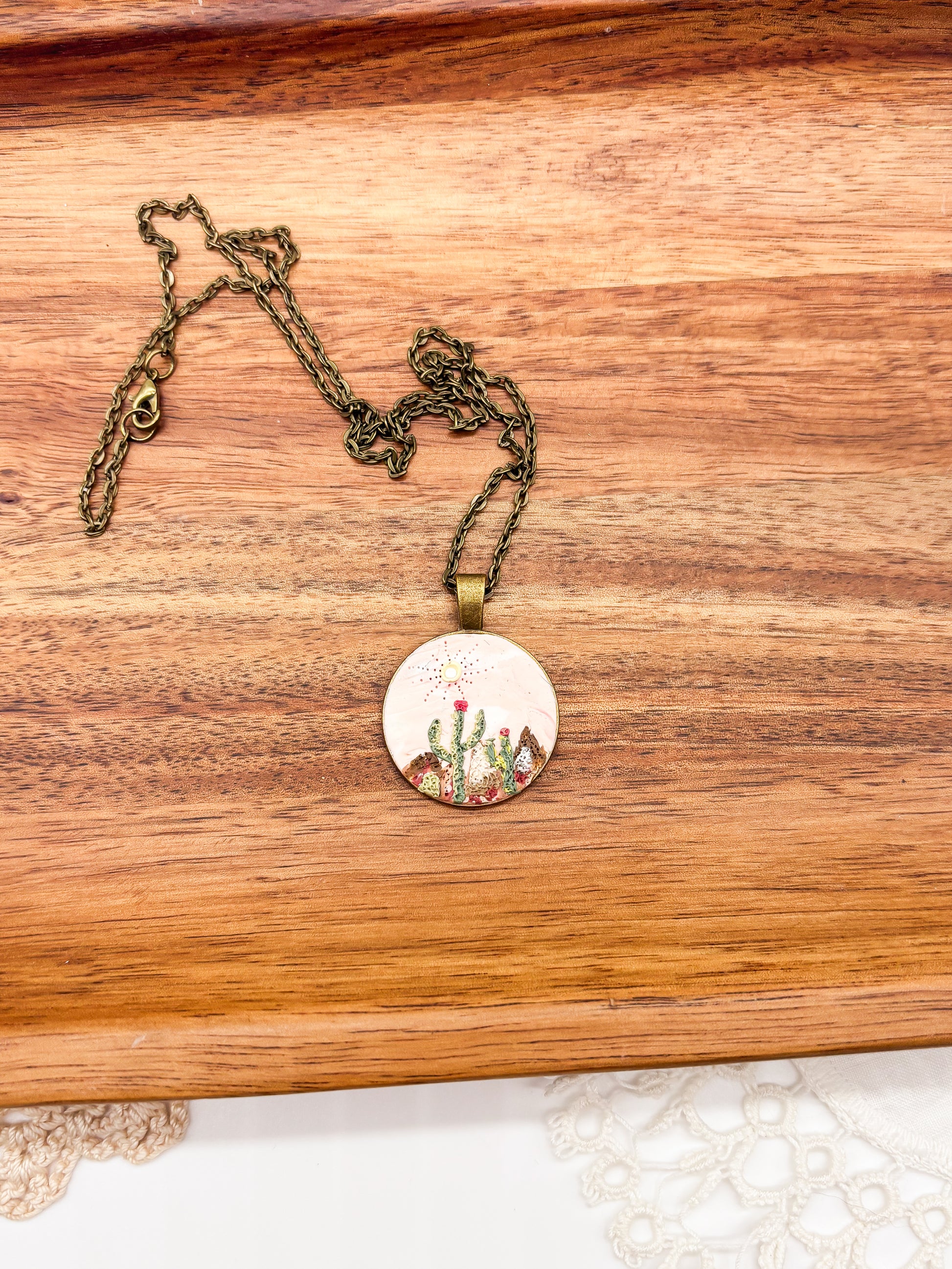This round polymer clay necklace captures a stunning desert sunset landscape, featuring warm hues that evoke the peaceful end of the day. Hanging from a 20-inch antique bronze chain, it combines handcrafted artistry with natural beauty, making it a perfect accessory for those who appreciate serene desert scenes and unique jewelry.
