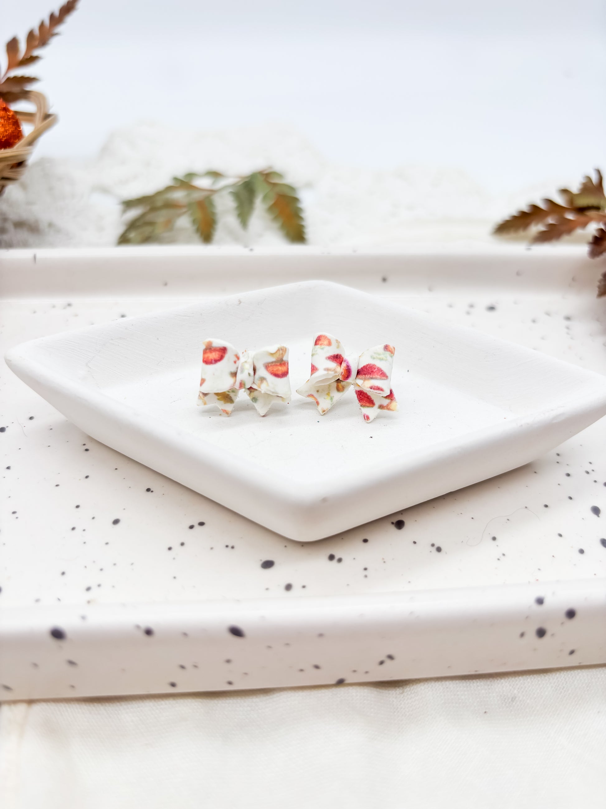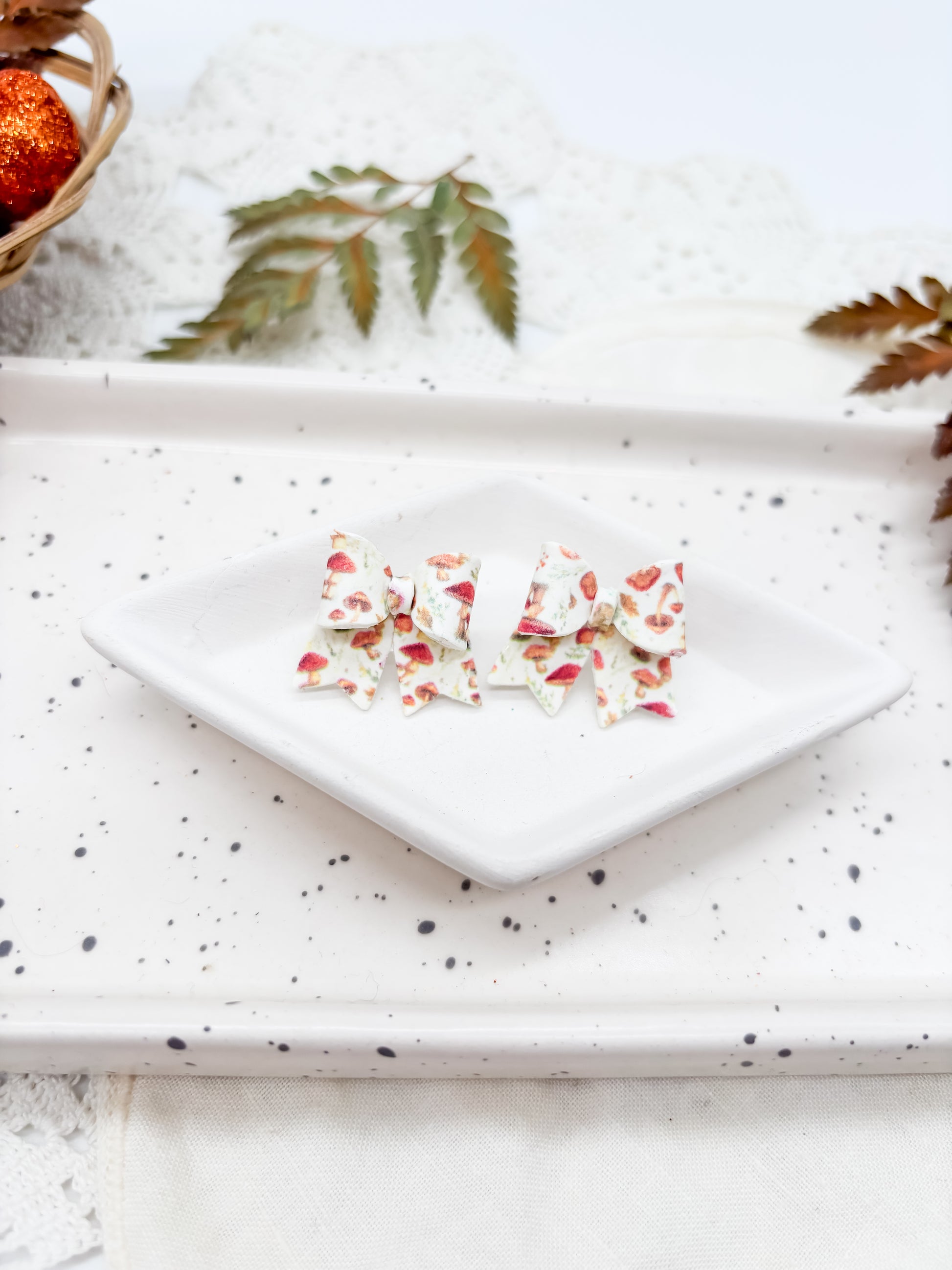 These polymer clay bow studs come in two sizes, each adorned with a charming woodland mushroom pattern. Lightweight and detailed, they add a whimsical yet refined accent to your outfit, perfect for nature lovers who appreciate subtle, playful accessories.
