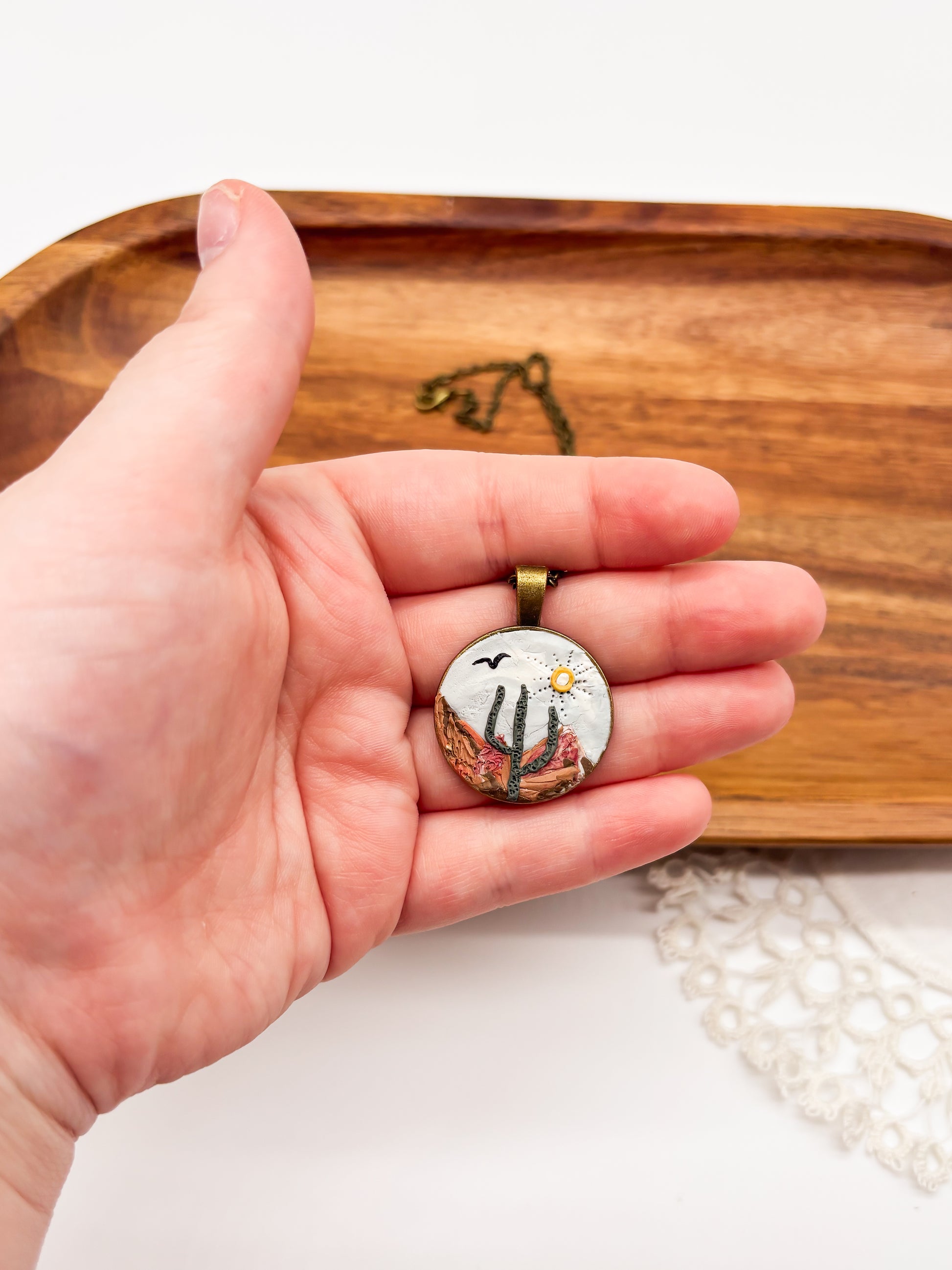 This charming round polymer clay pendant captures a serene desert landscape, featuring a delicate cactus, rugged desert rocks, and a bright blue sky with a shining sun. Suspended from an antique bronze chain, this necklace combines artistic detail with a touch of rustic elegance, perfect for nature lovers who appreciate handcrafted jewelry with a story.