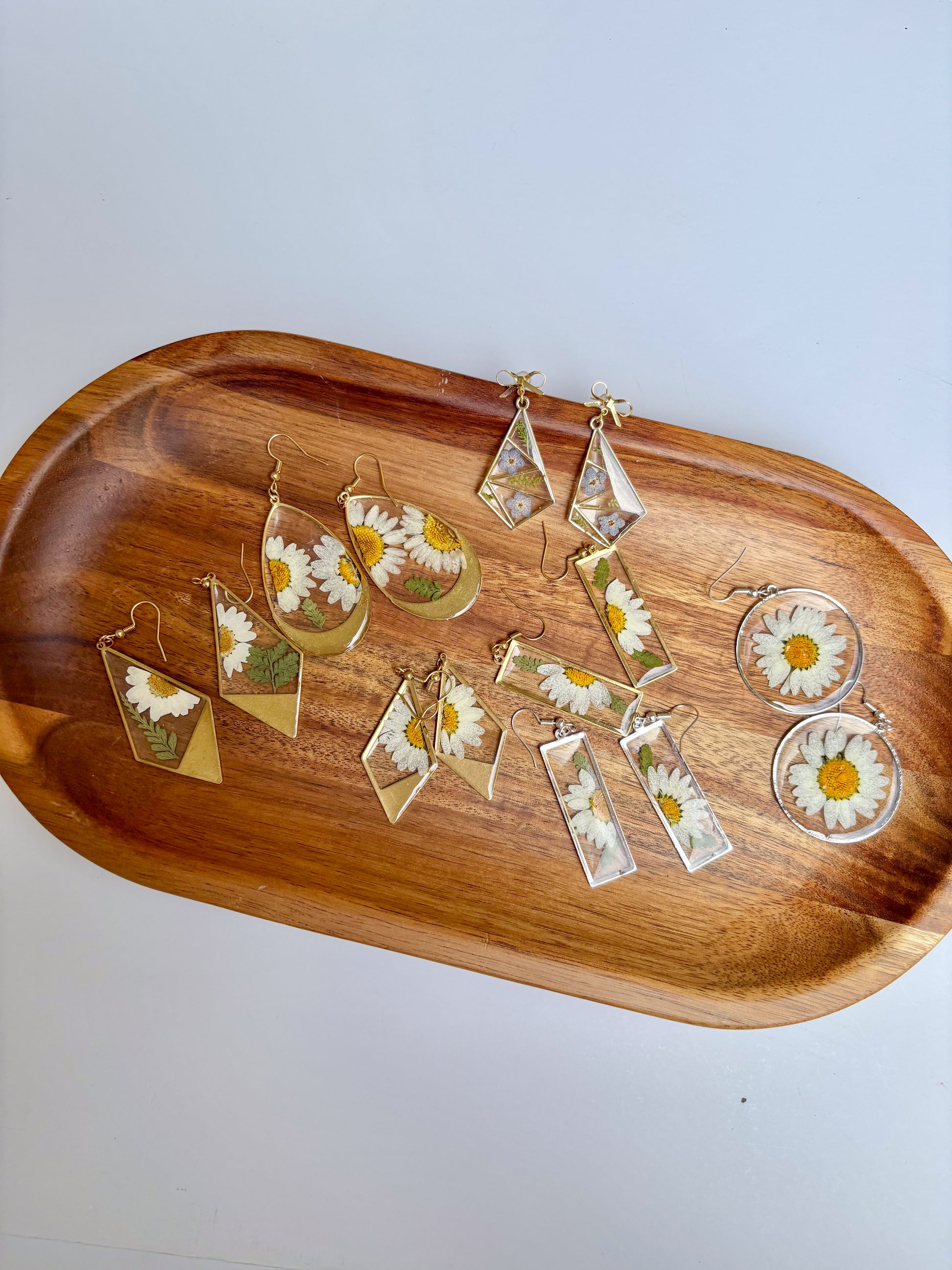 Delight in the charm of real pressed daisy flowers, beautifully encased in silver-plated round bezels. These delicate silver daisy circles hang gracefully from silver-plated French hooks, combining natural elegance with refined craftsmanship. Perfect for adding a subtle, nature-inspired touch to any outfit.