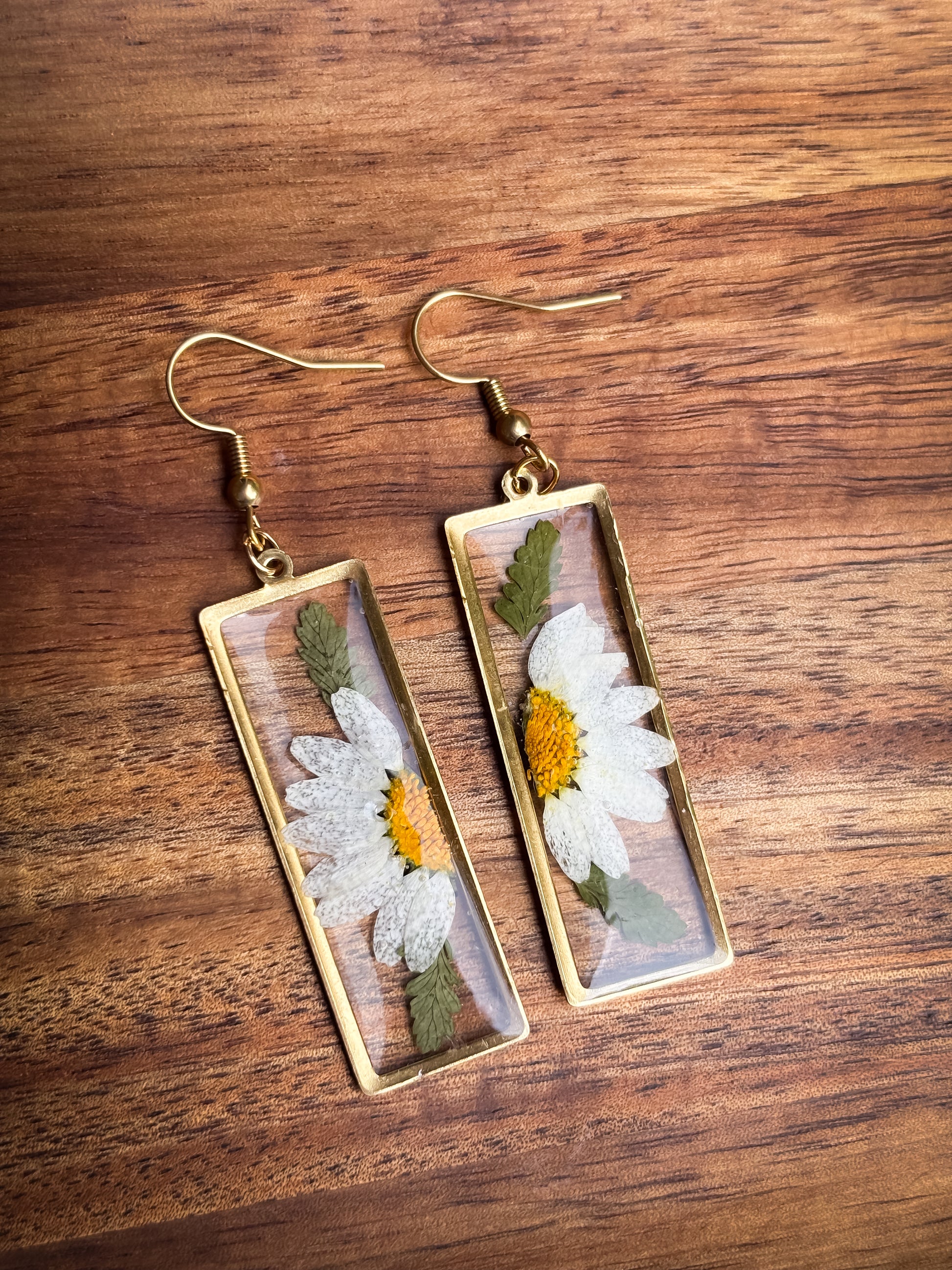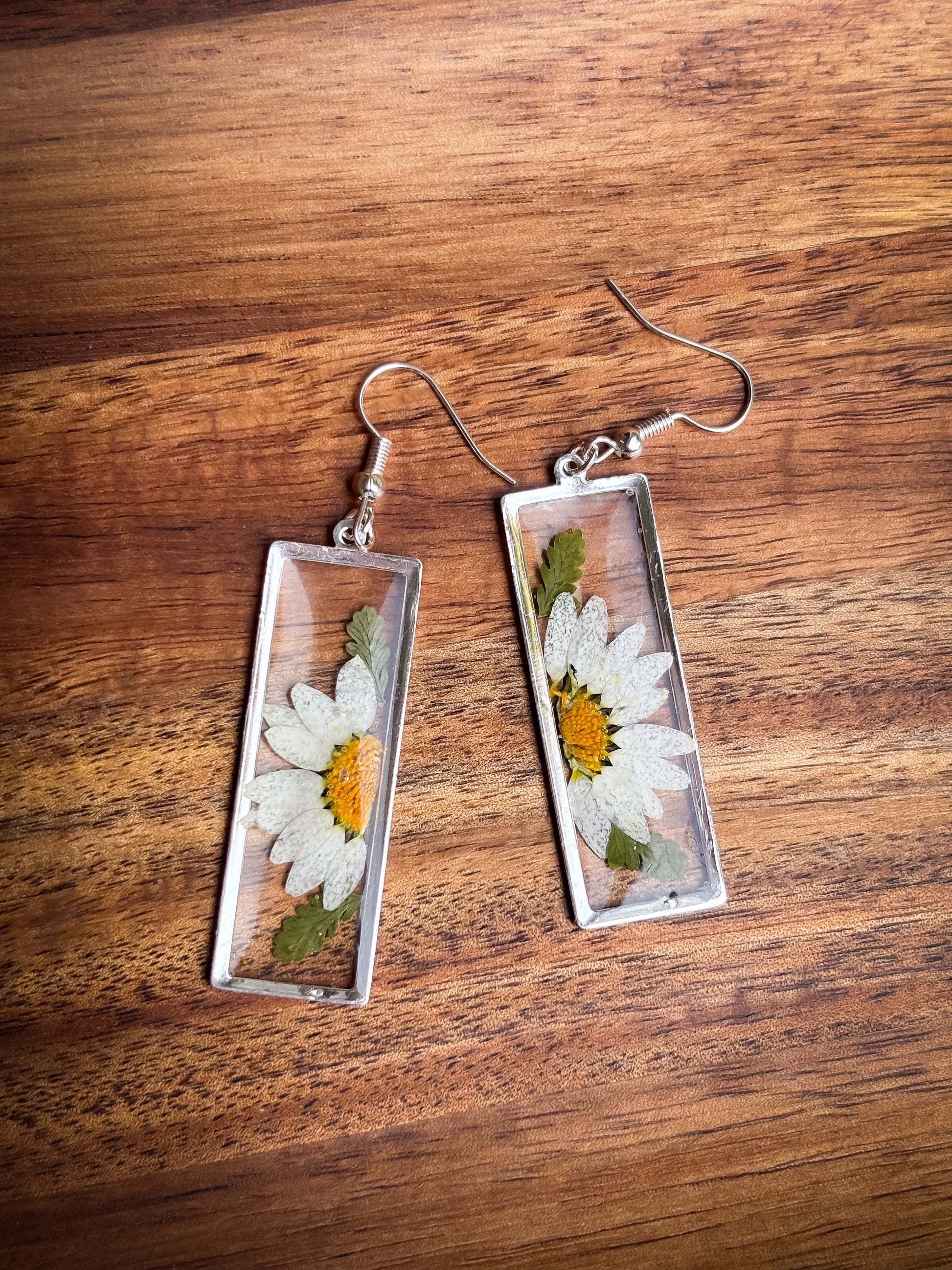 Delight in the charm of real pressed daisy flowers, beautifully encased in silver or gold toned rectangle bezels. These delicate silver daisy hang gracefully from silver or gold plated French hooks, combining natural elegance with refined craftsmanship. Perfect for adding a subtle, nature-inspired touch to any outfit.