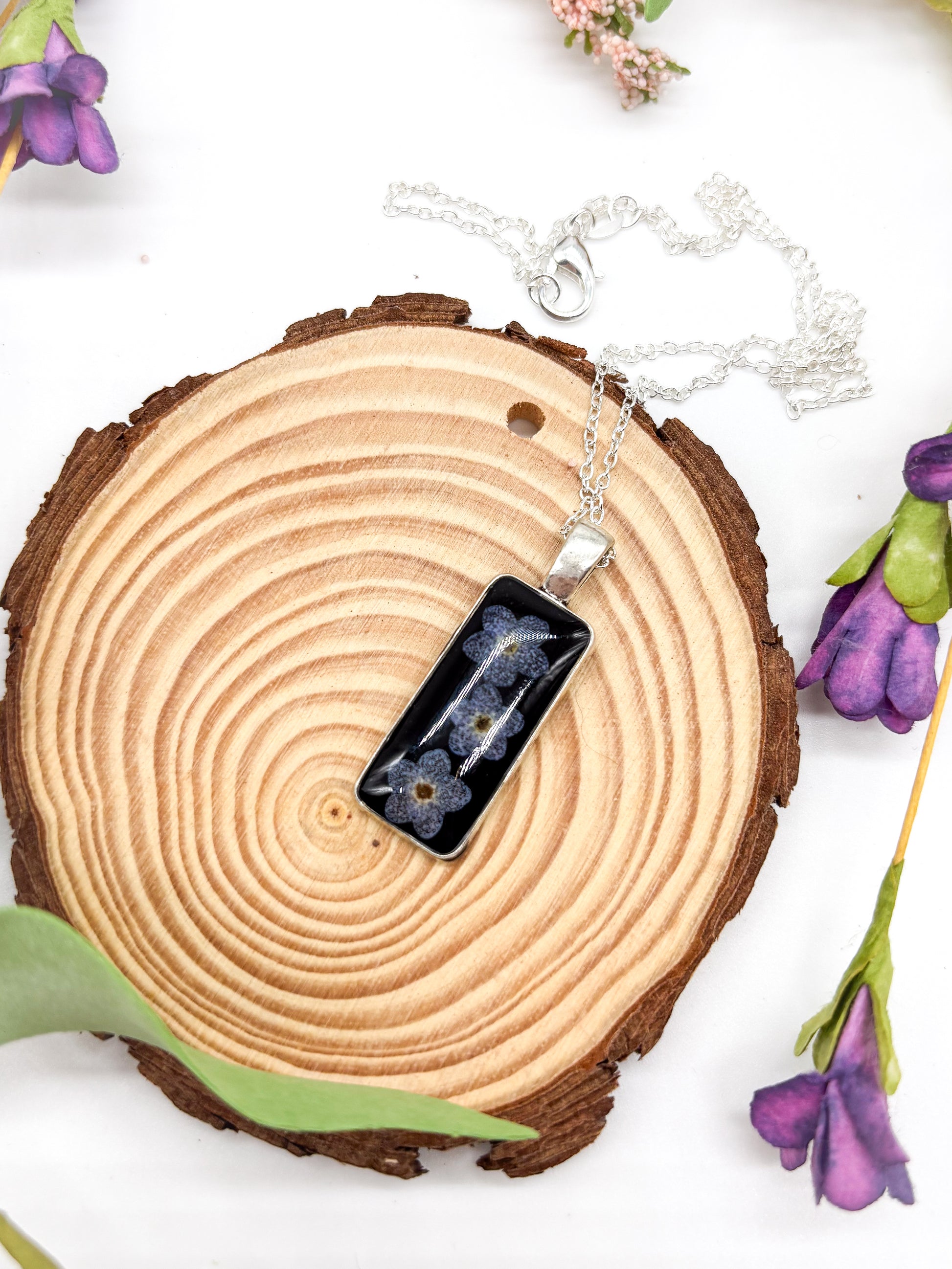 Add a touch of nature and elegance to your outfit with our silver plated necklace. Its black pendant features real forget me not flowers, making it a unique and beautiful piece. Perfect for any occasion, this necklace is a must-have in your jewelry collection.