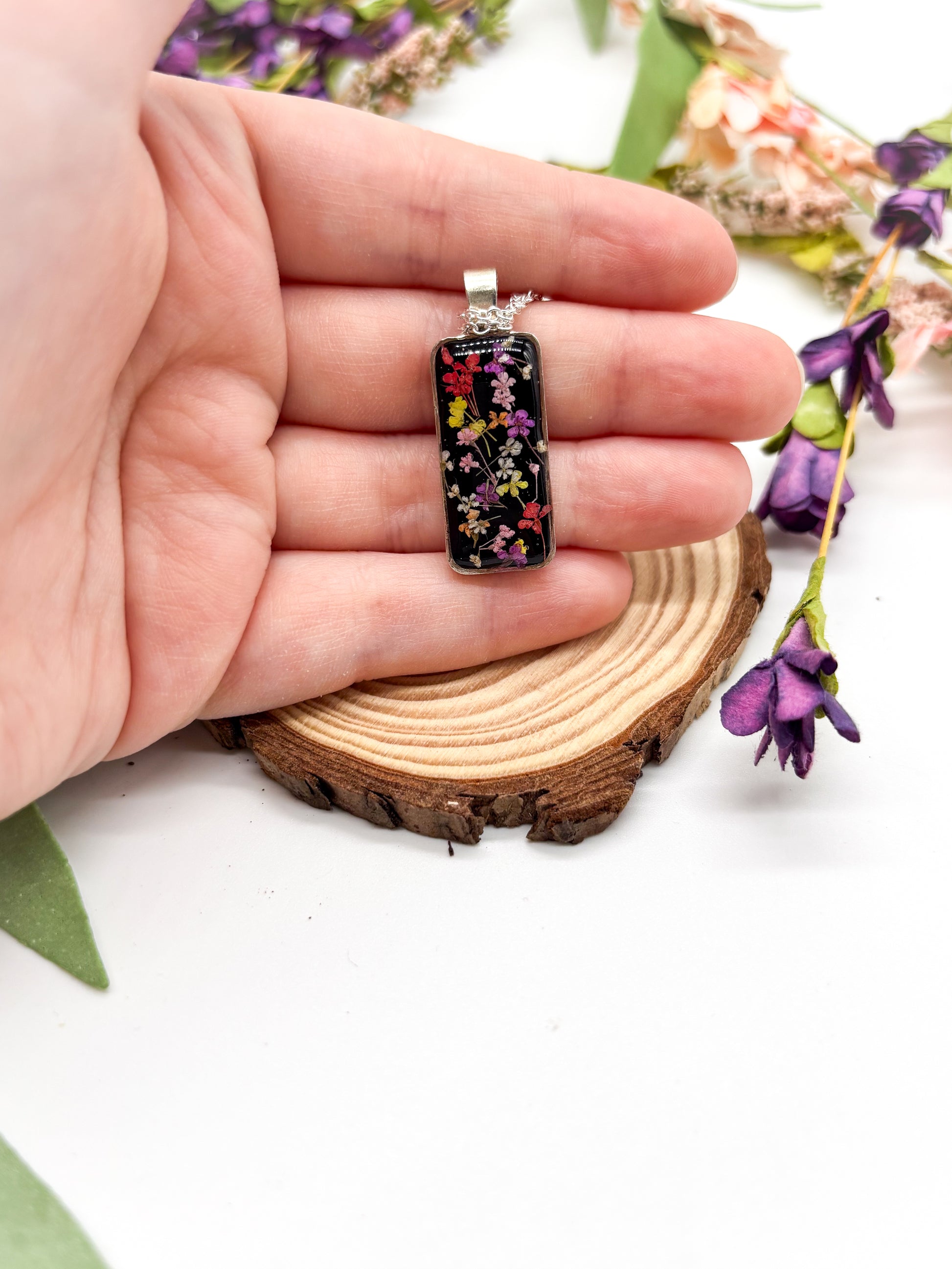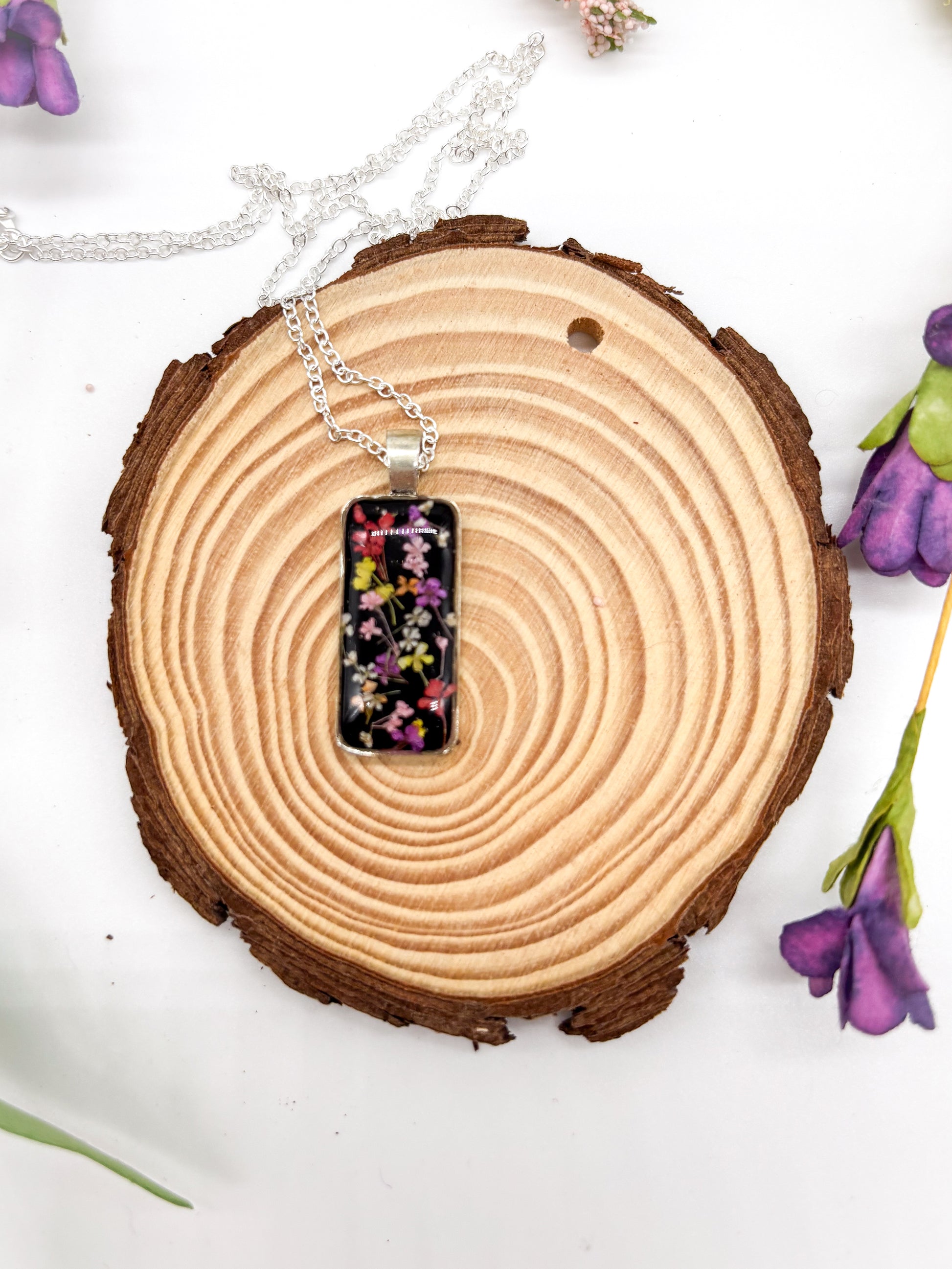 This adorable necklace features a silver plated chain with a stylish black pendant. The pendant is adorned with delicate multi-colored flowers, making it the perfect accessory to add a pop of color to any outfit. Elevate your style with this cute and unique necklace.