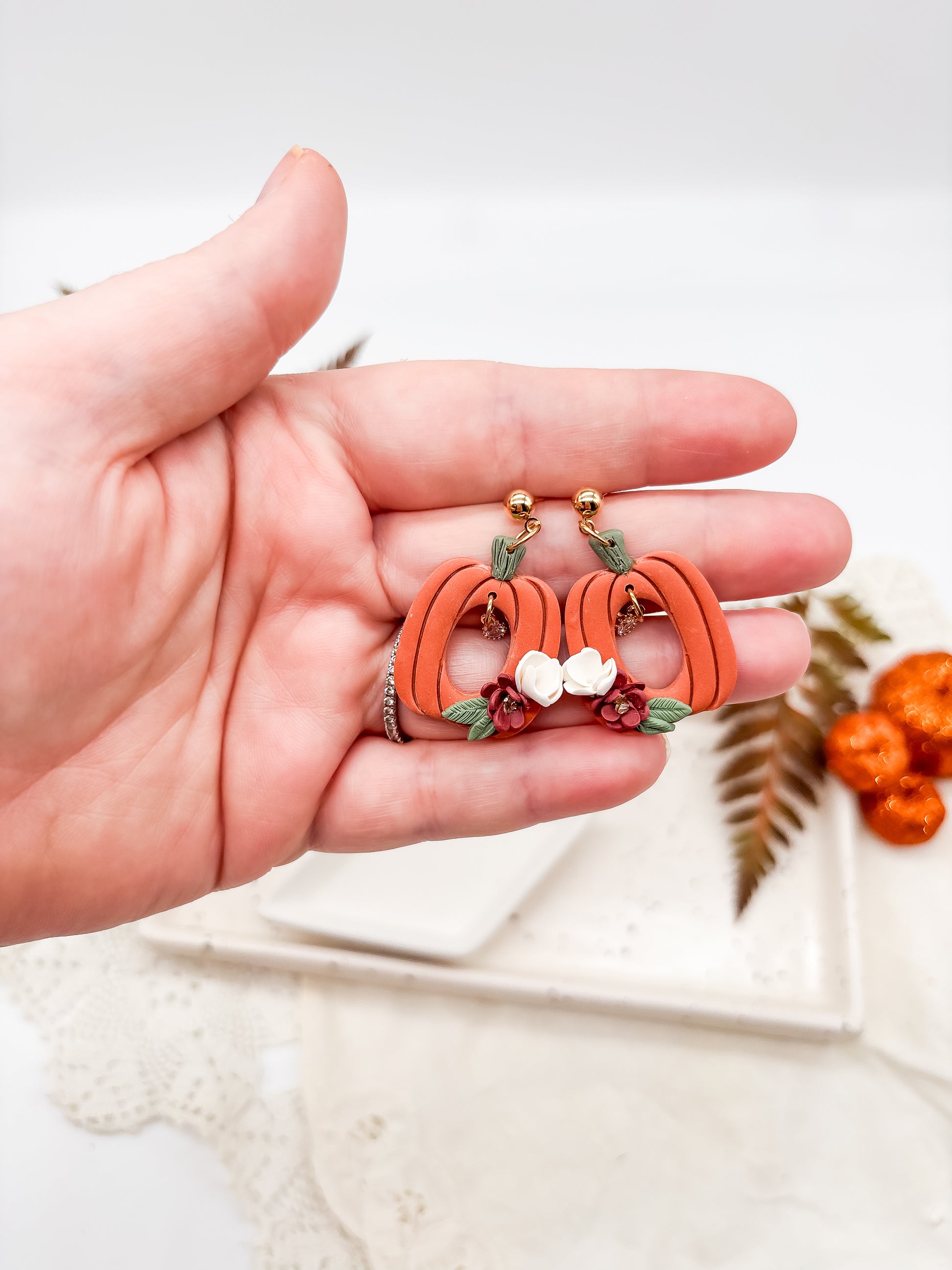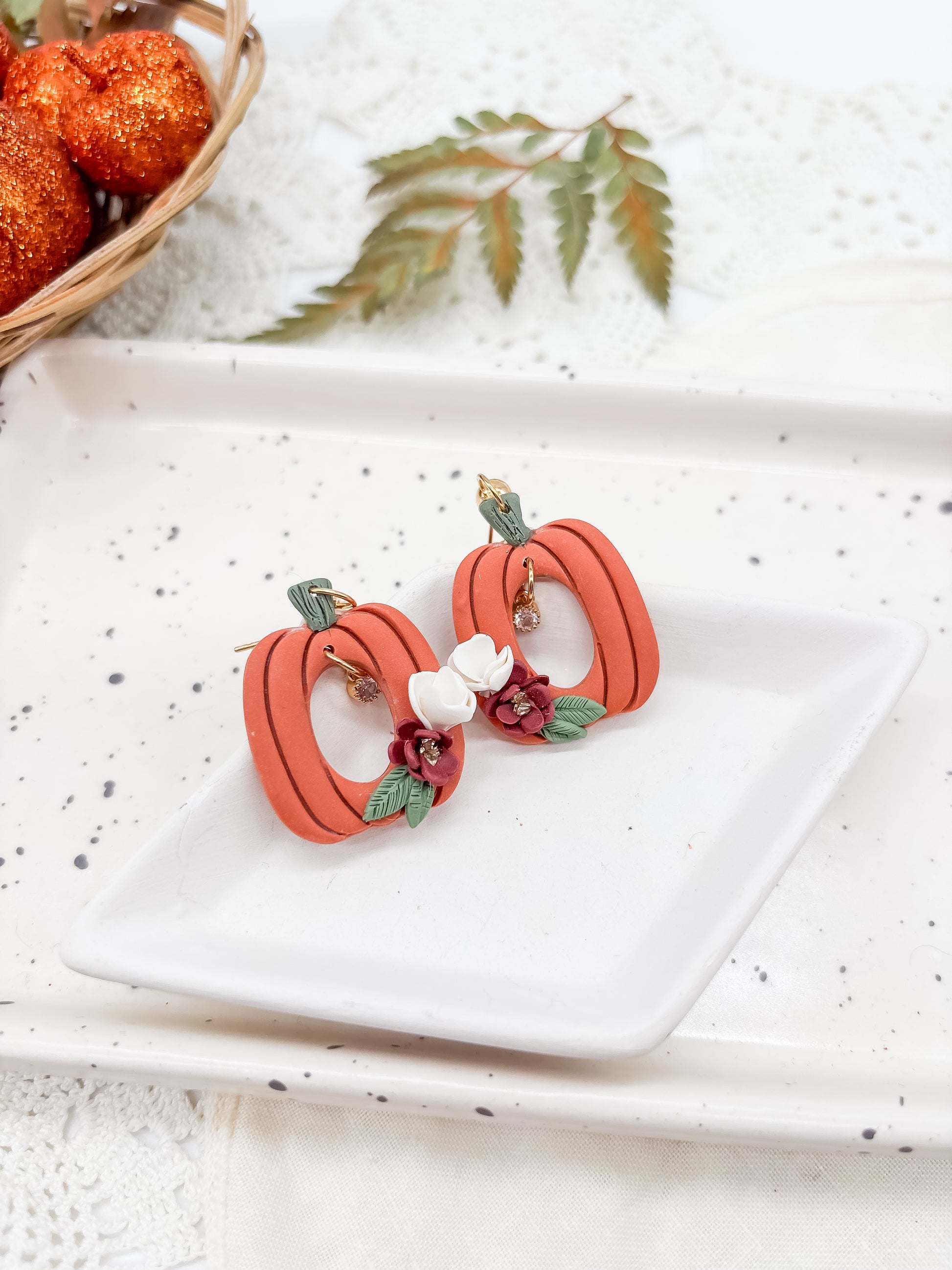 These Orange Pumpkin earrings showcase charming polymer clay pumpkins featuring a delicate cut-out design, each adorned with a sparkling cubic zirconia charm nestled inside. Lightweight and playful, they add a festive yet refined touch to any outfit, perfect for celebrating the season with subtle elegance.