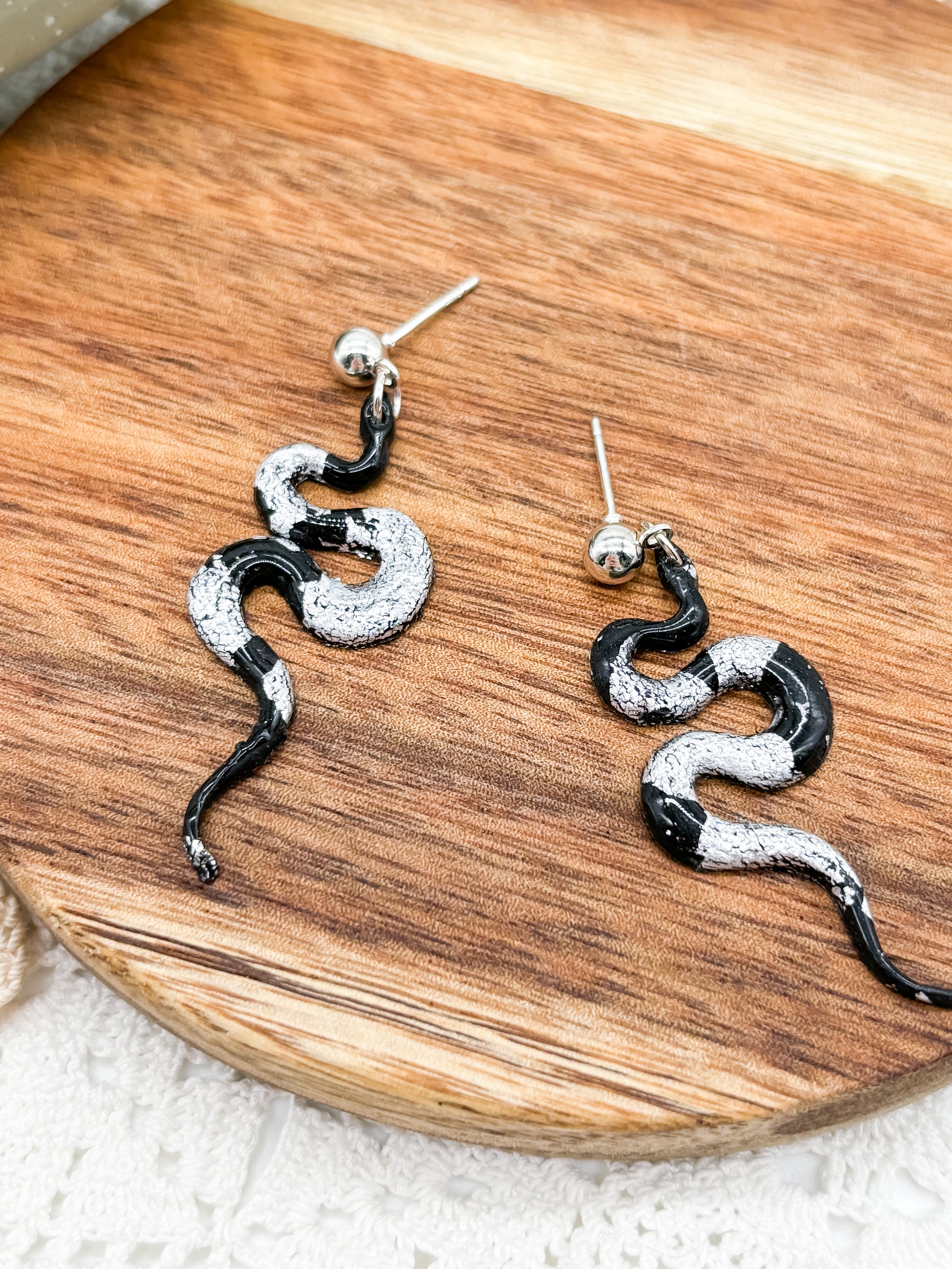 Transform your look with our black and gold, or black and silver snake earrings made of quality polymer clay. The matching ball post adds a touch of sophistication to these cute but elegant statement pieces.
