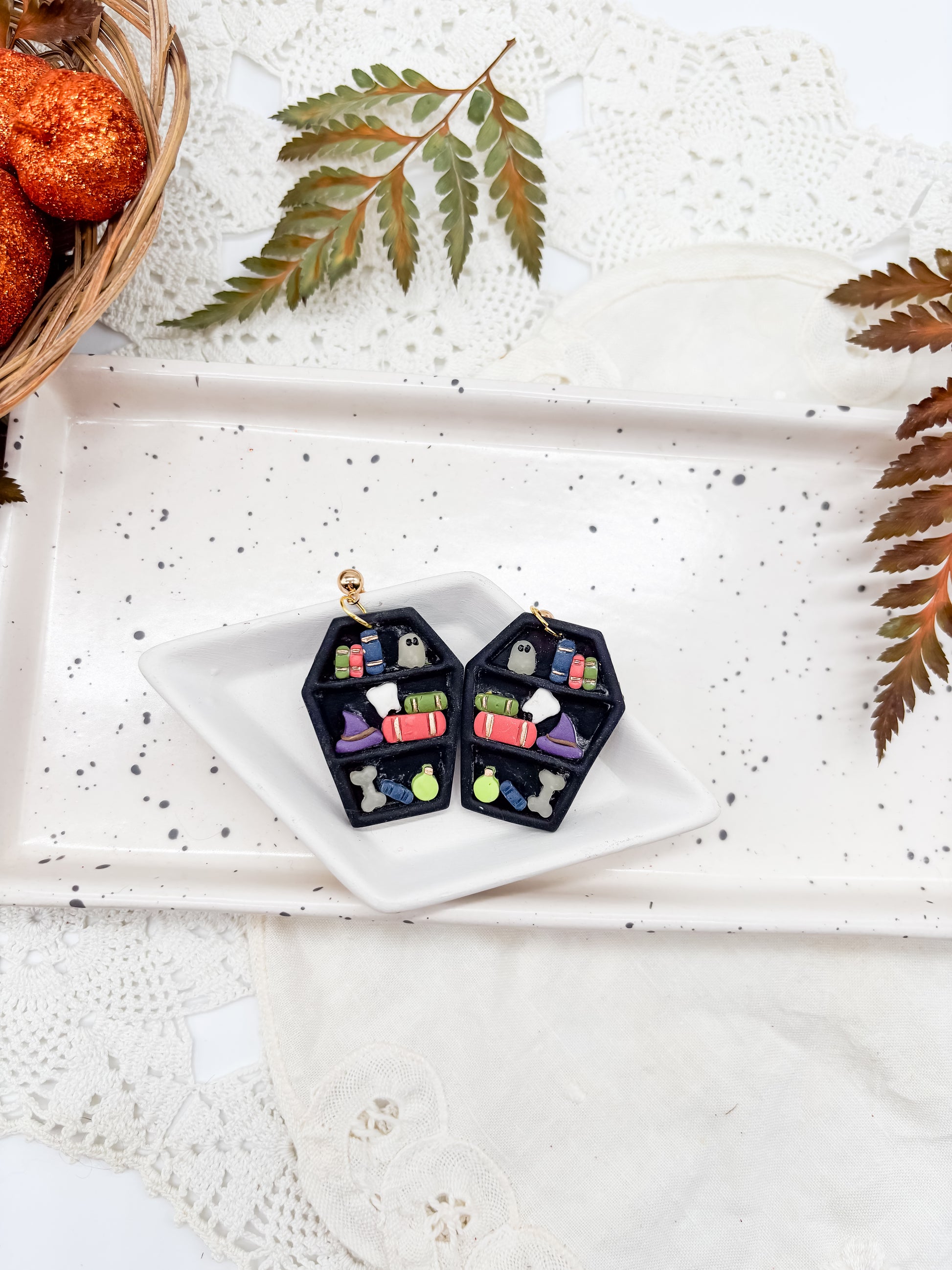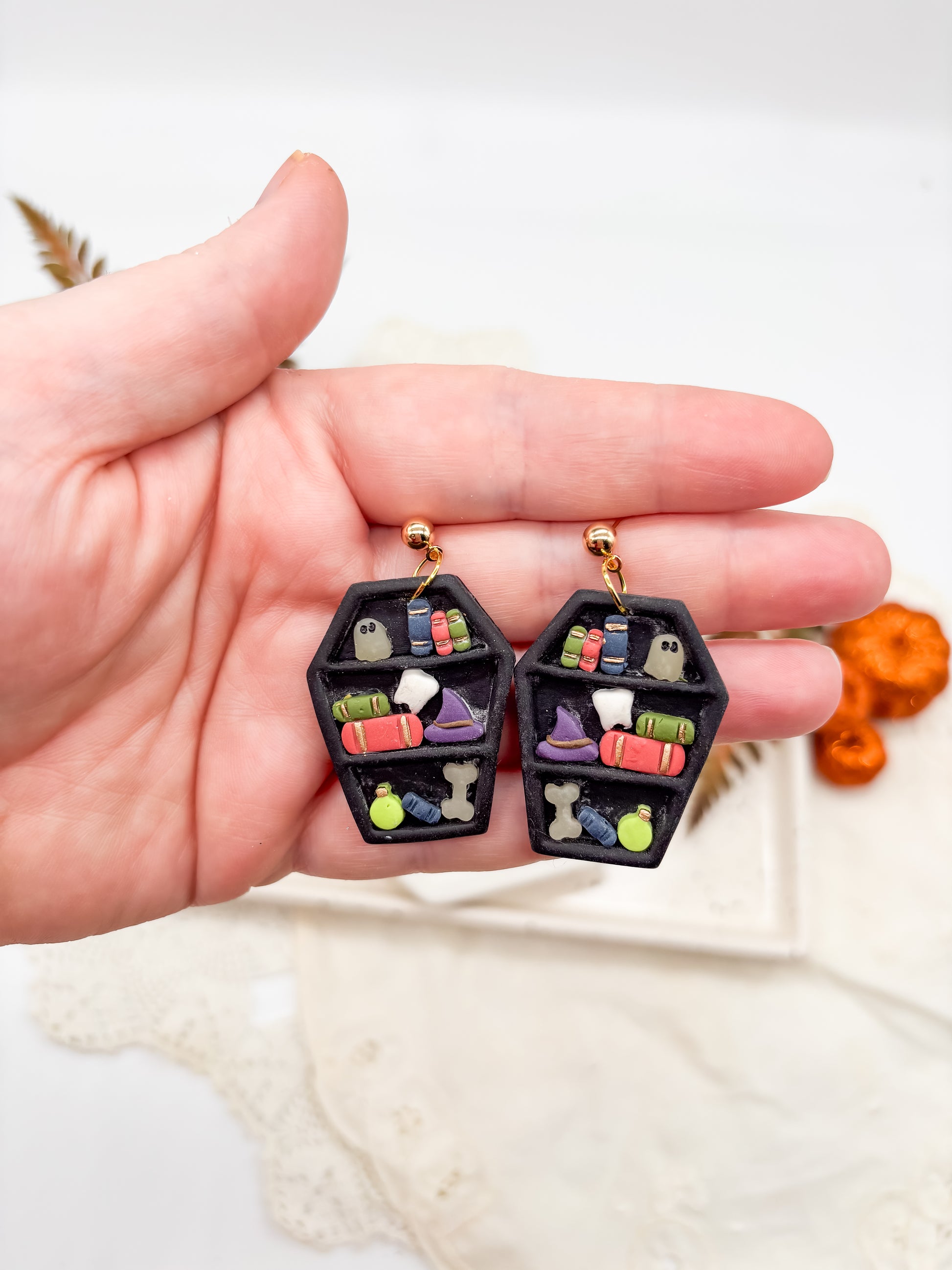 These Spooky Bookshelf Earrings bring a playful Halloween vibe with their coffin shapes crafted from durable polymer clay. Choose from two unique styles and two metal finishes to match your spooky spirit. Lightweight and comfortable, they’re perfect for adding a subtle seasonal touch to any outfit while showcasing your love for eerie aesthetics.