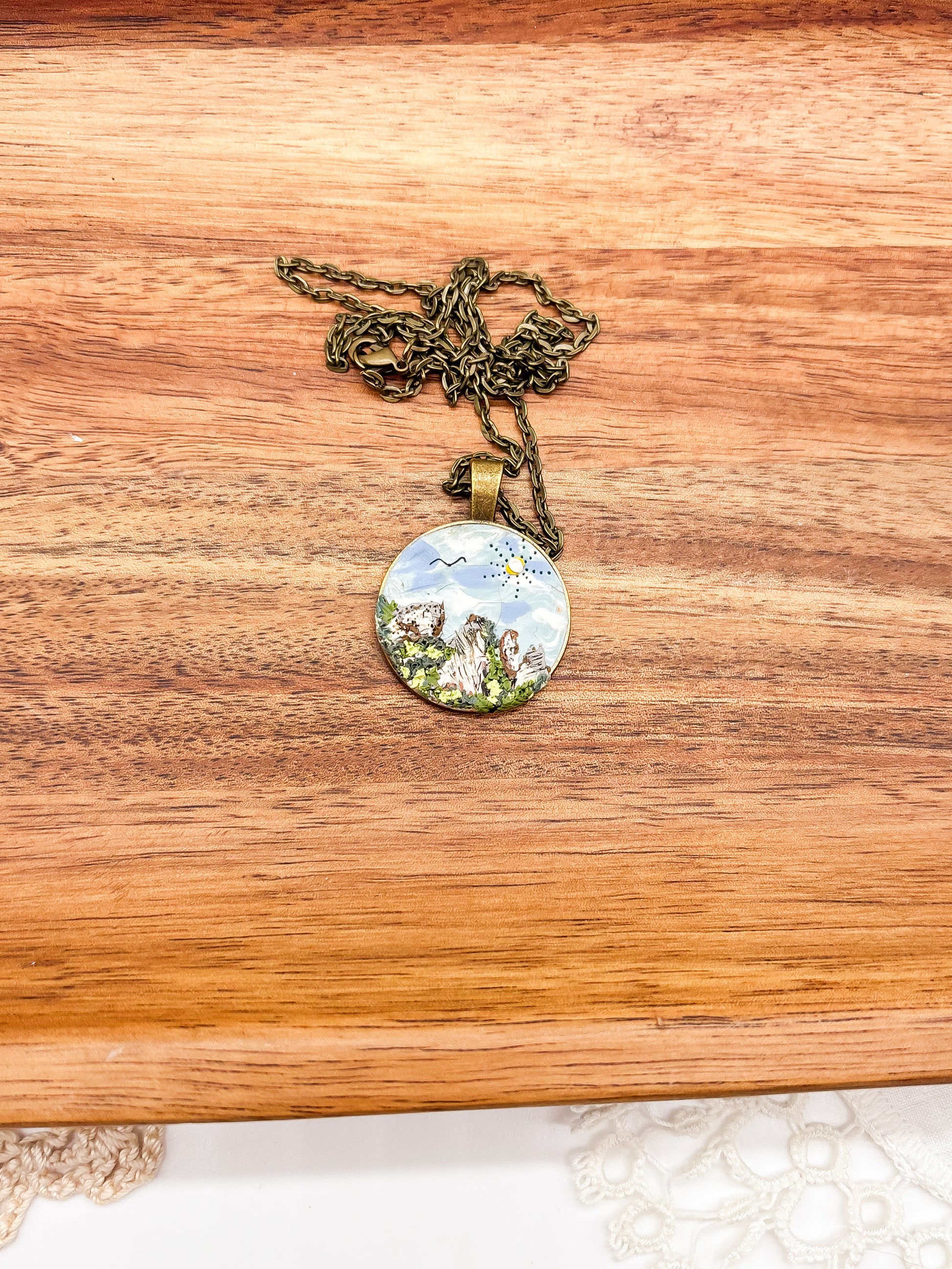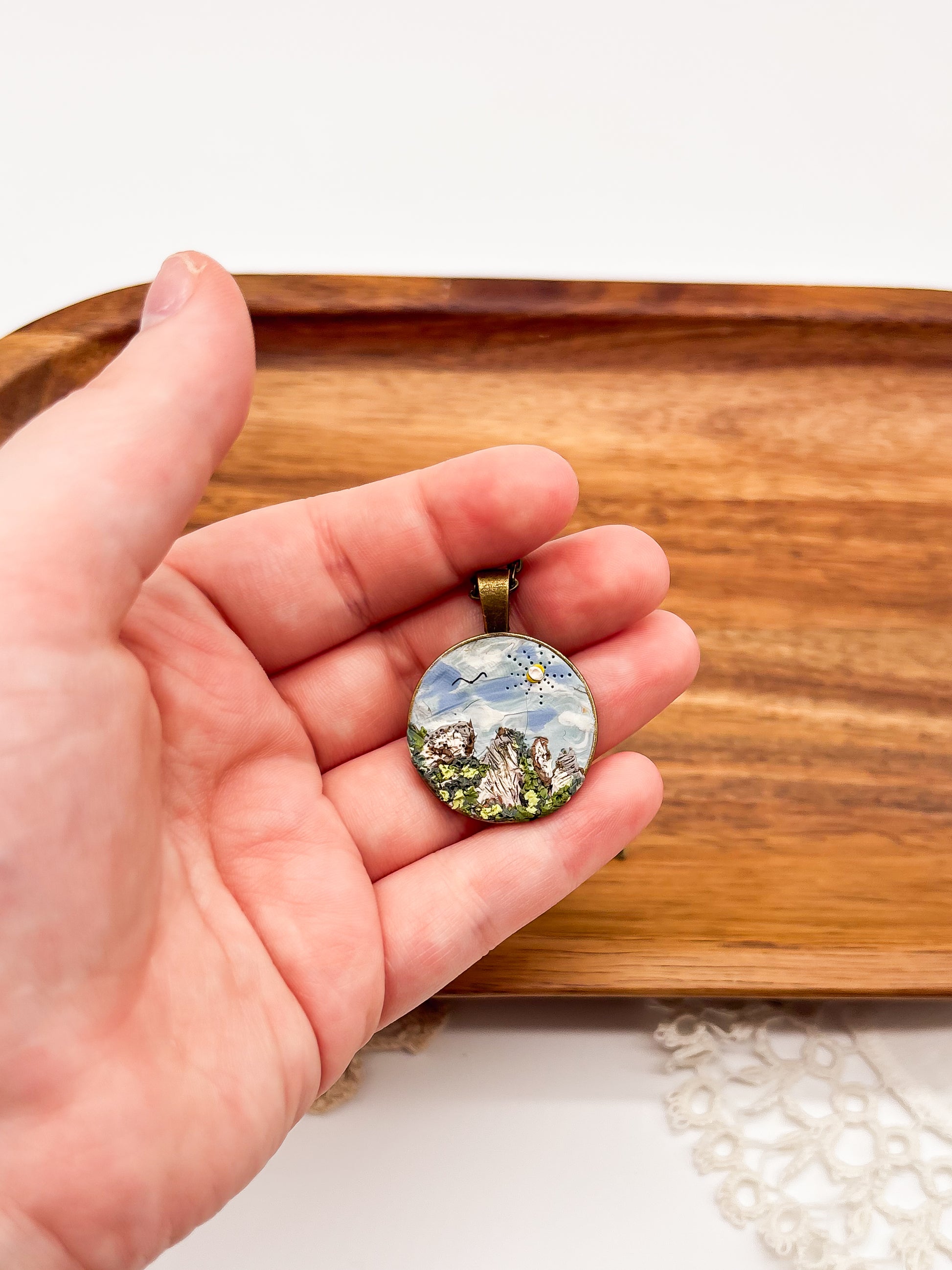 This round polymer clay necklace features a detailed mountain landscape, capturing the rugged beauty of nature in miniature form. Suspended on a 20-inch antique bronze chain, it offers a charming and handcrafted accessory perfect for outdoor lovers and fans of unique, artistic jewelry.