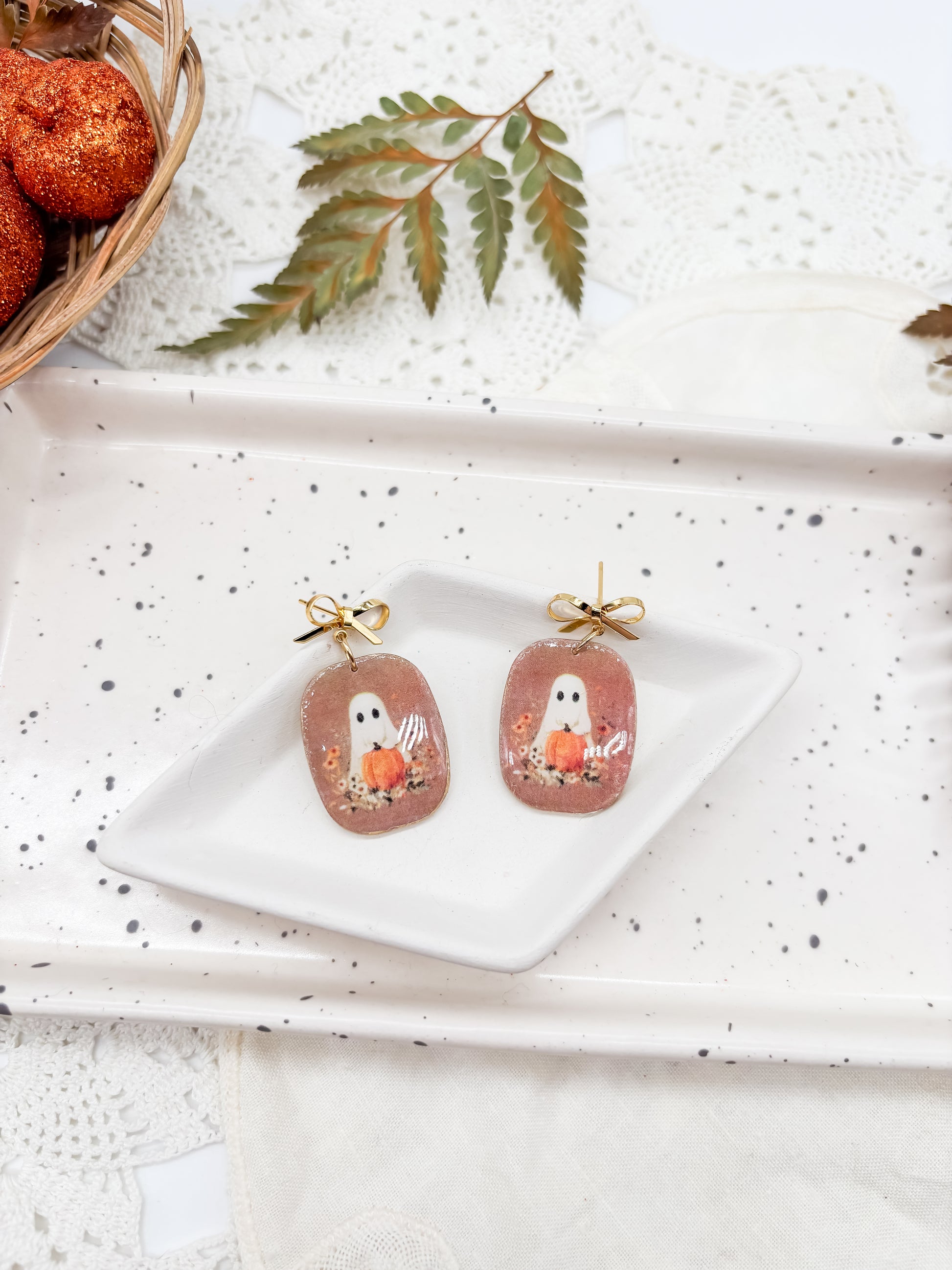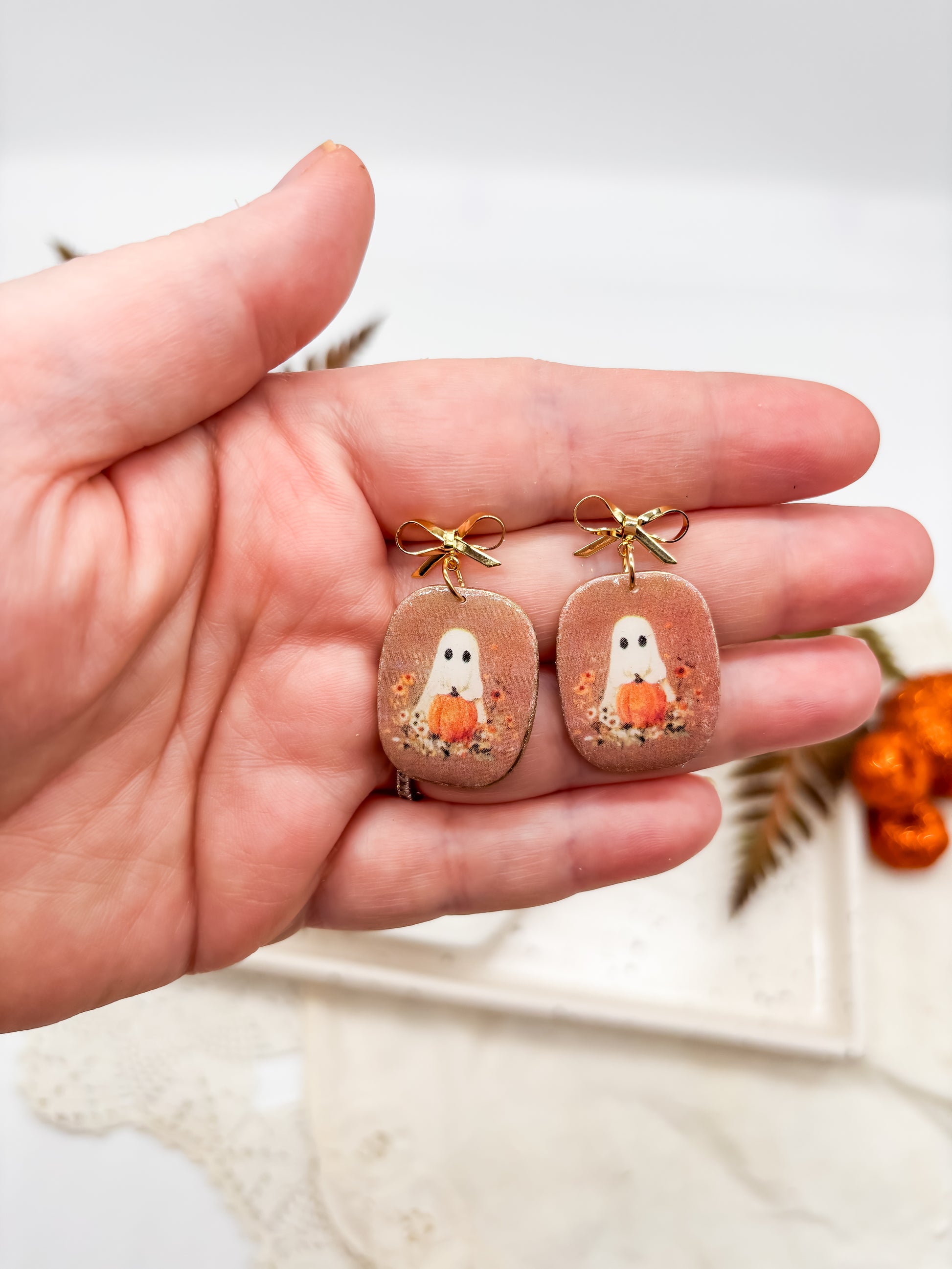 These charming polymer clay earrings feature vintage boho style ghosties holding a pumpkin with a burnt orange background with gold bow posts. The earrings are available with silver or gold edges and bows, offering versatile style options that blend whimsy with classic elegance.