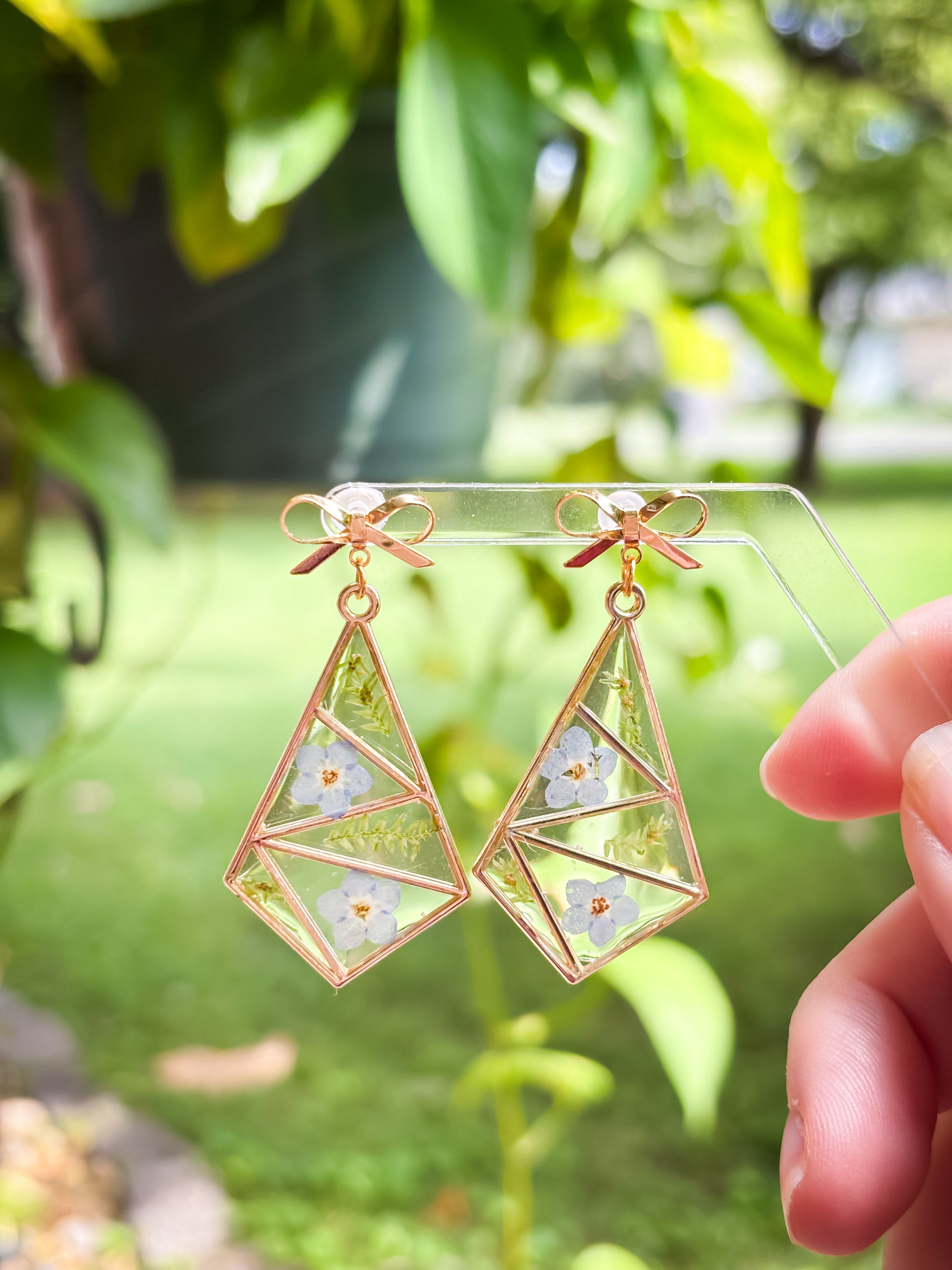 Delight in the charm of real pressed forget me not flowers, beautifully encased in gold plated diamond shaped bezels. These delicate forget me nots hang gracefully from gold plated French hooks, combining natural elegance with refined craftsmanship. Perfect for adding a subtle, nature-inspired touch to any outfit.