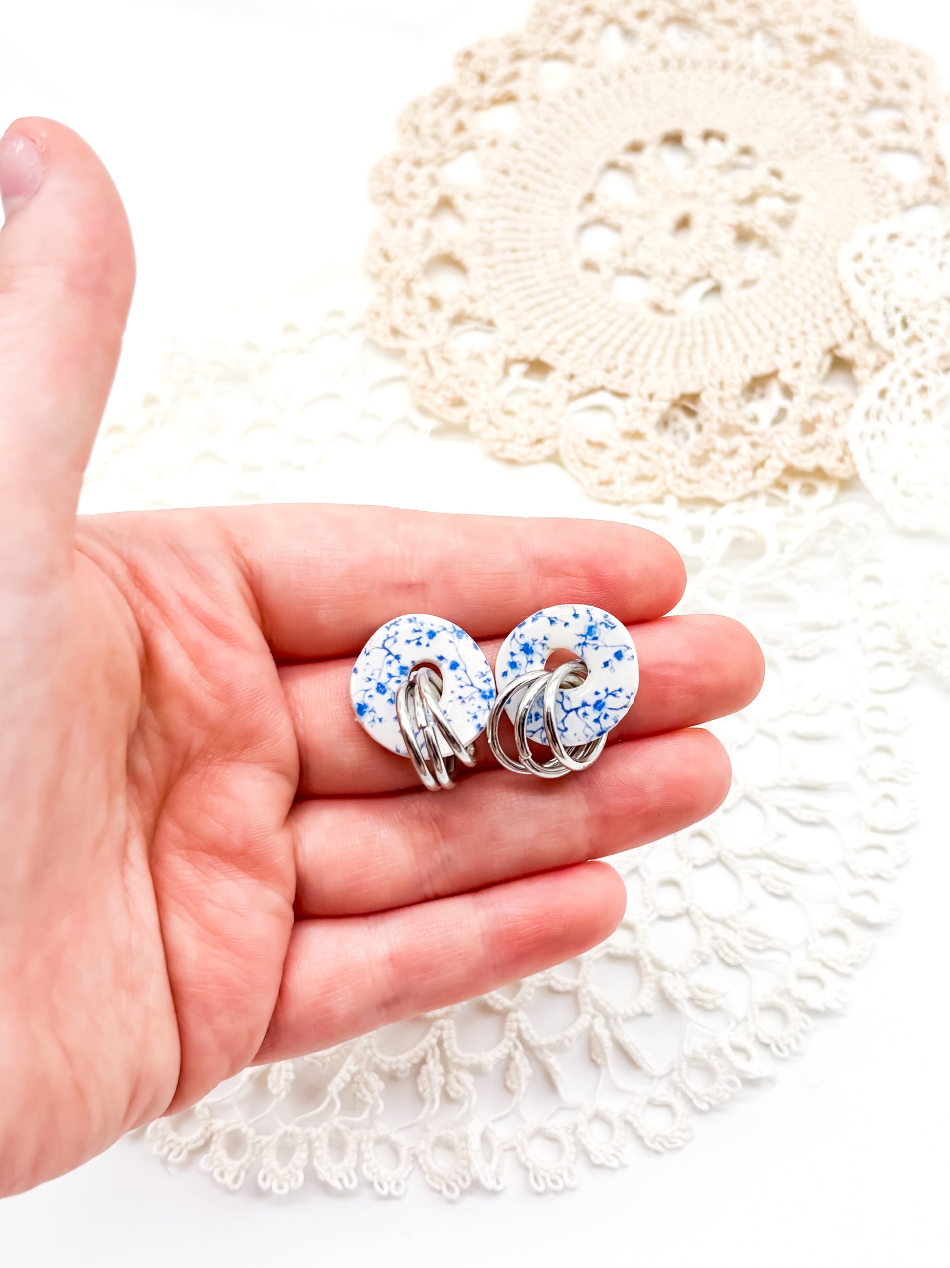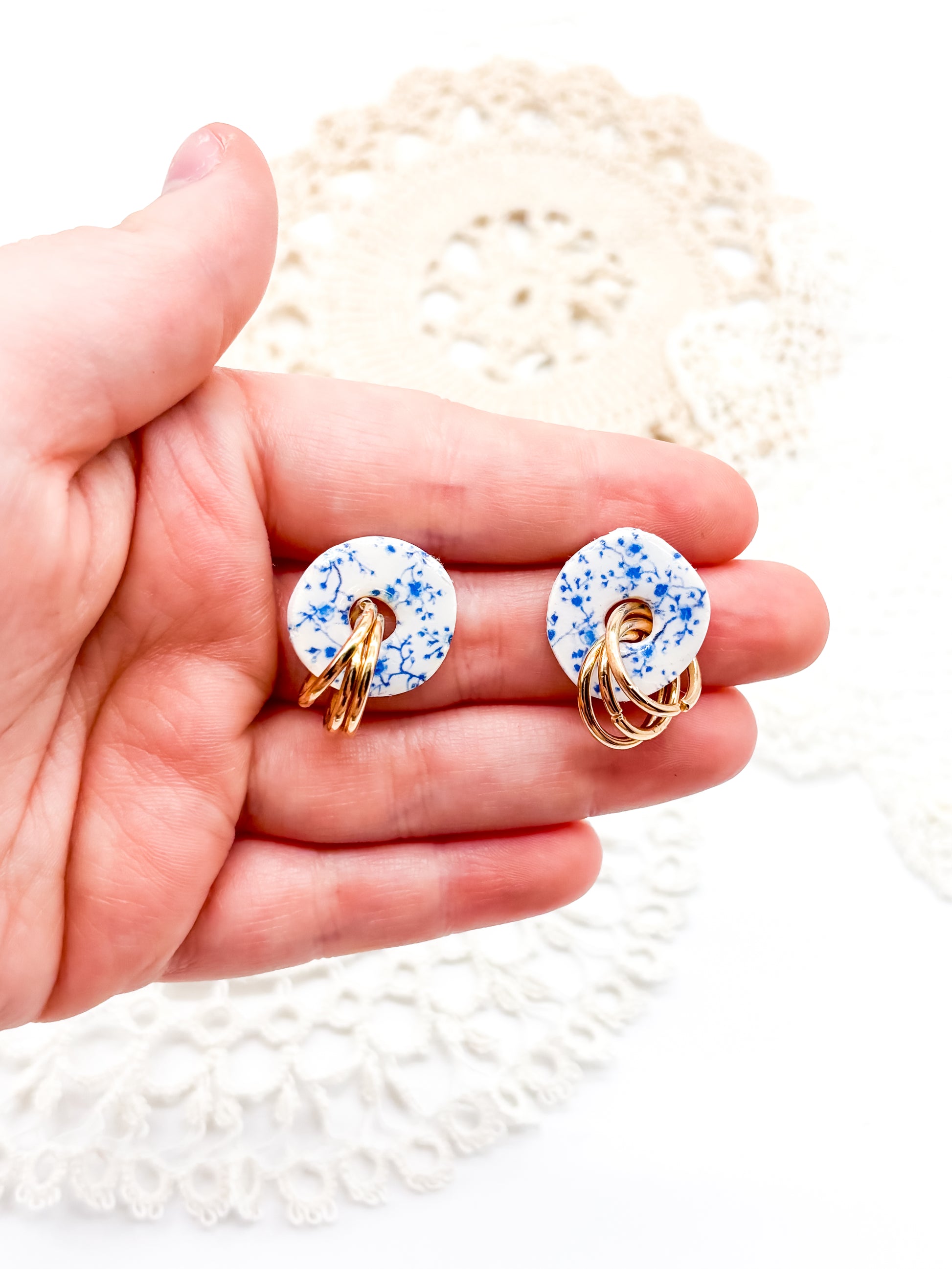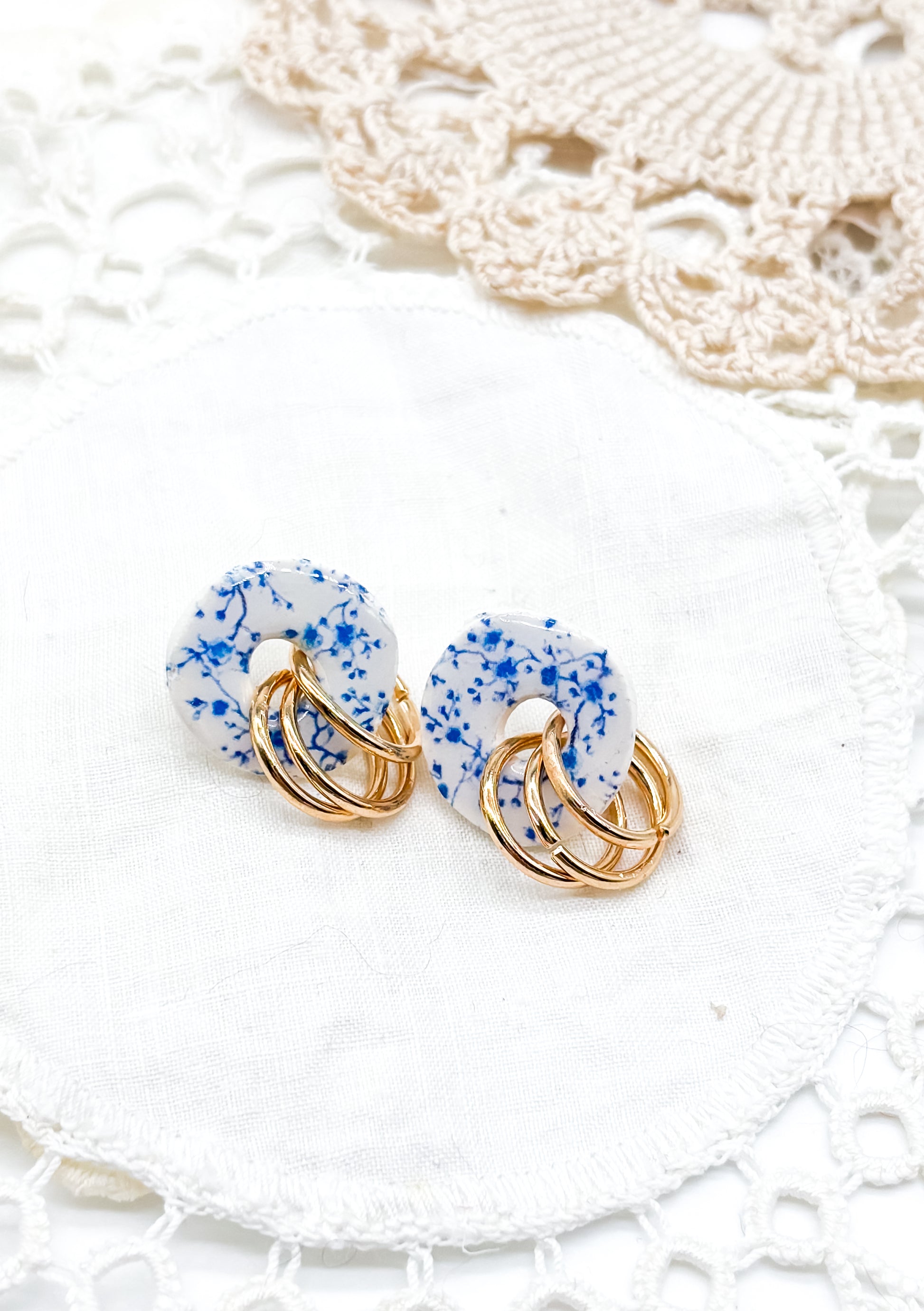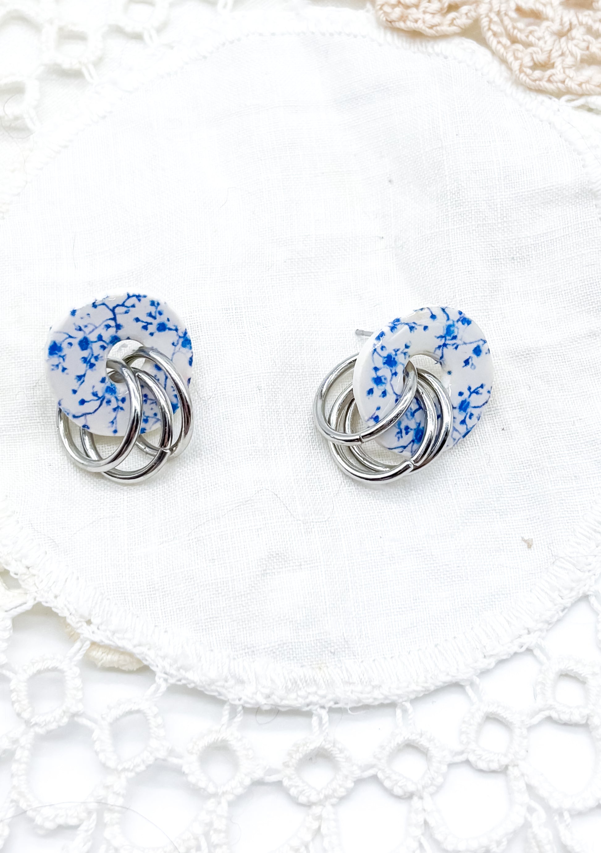 These delicate polymer clay studs feature a tiny blue flower print and have gold or silver rings. Lightweight and charming, they add a subtle touch of nature-inspired elegance to any outfit, perfect for those who appreciate handcrafted artistry with a playful yet refined style.