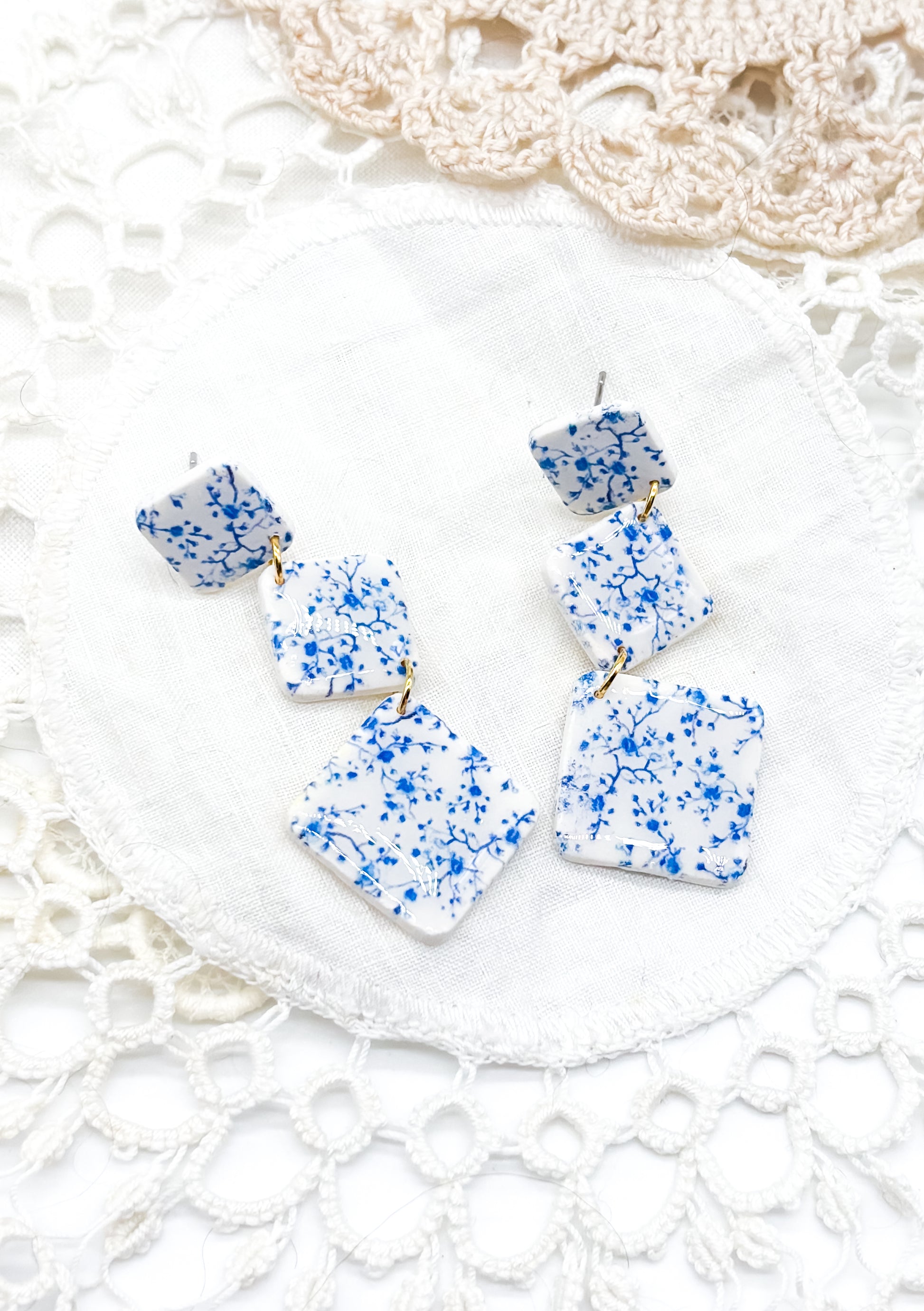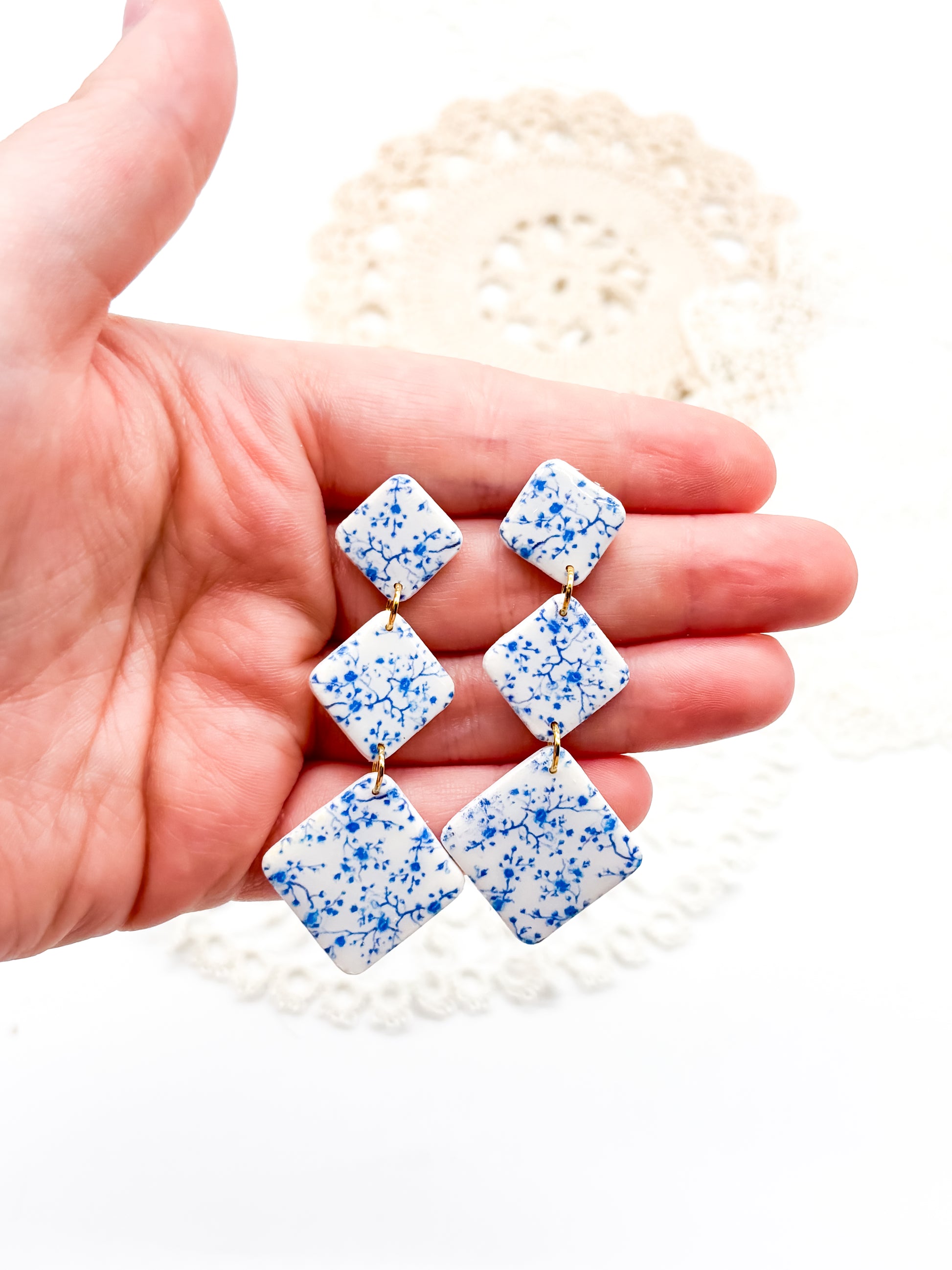 These delicate polymer clay dangles feature three different sized squares, each adorned with tiny blue flowers. Lightweight and charming, they add a subtle touch of nature-inspired elegance to any outfit, perfect for those who appreciate handcrafted artistry with a playful yet refined style.