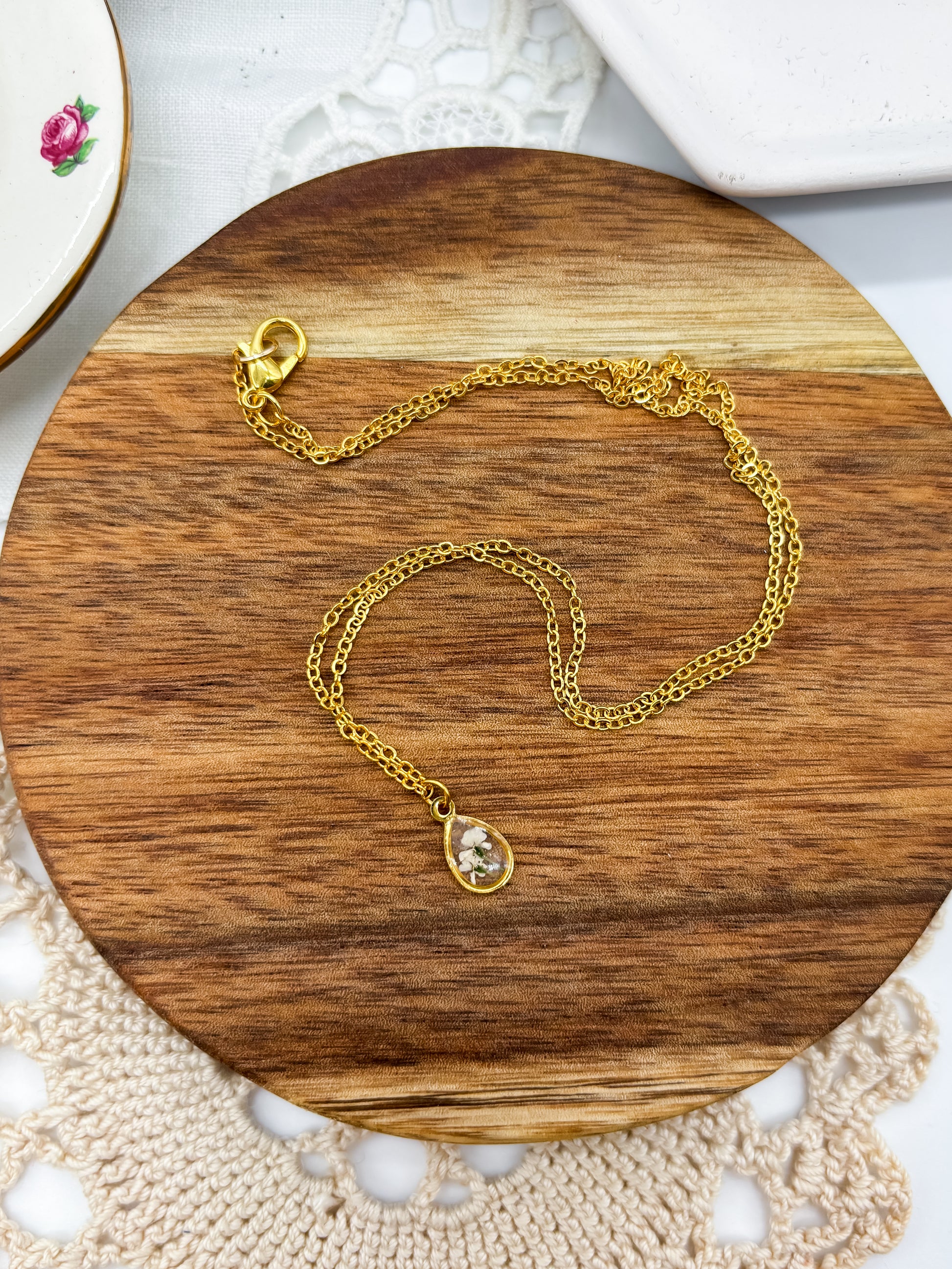 Add a touch of whimsy to your outfit with our Tiny Teardrop Pendant necklace! The delicate gold plated teardrop pendant is adorned with petite white pressed flowers, creating a charming and unique accessory. Its small size makes it perfect for layering or wearing alone for a cute and delicate look.