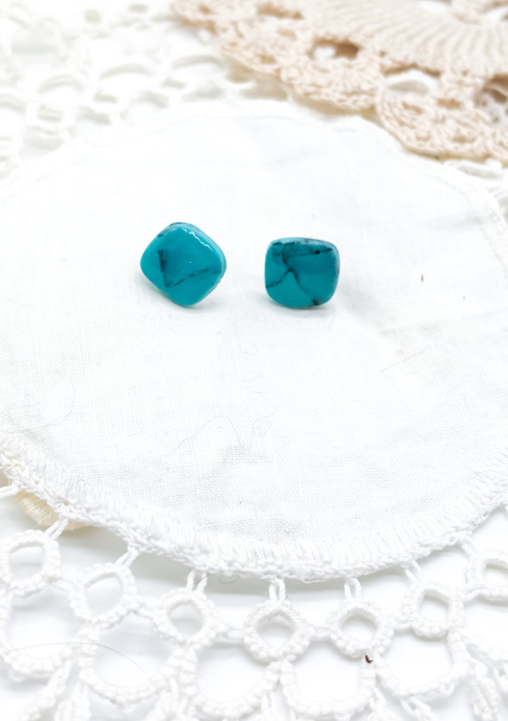 These charming studs feature an organic square shape crafted from polymer clay in a faux turquoise finish. Lightweight and stylish, they add a playful yet sophisticated touch to any outfit, perfect for everyday wear or special occasions.