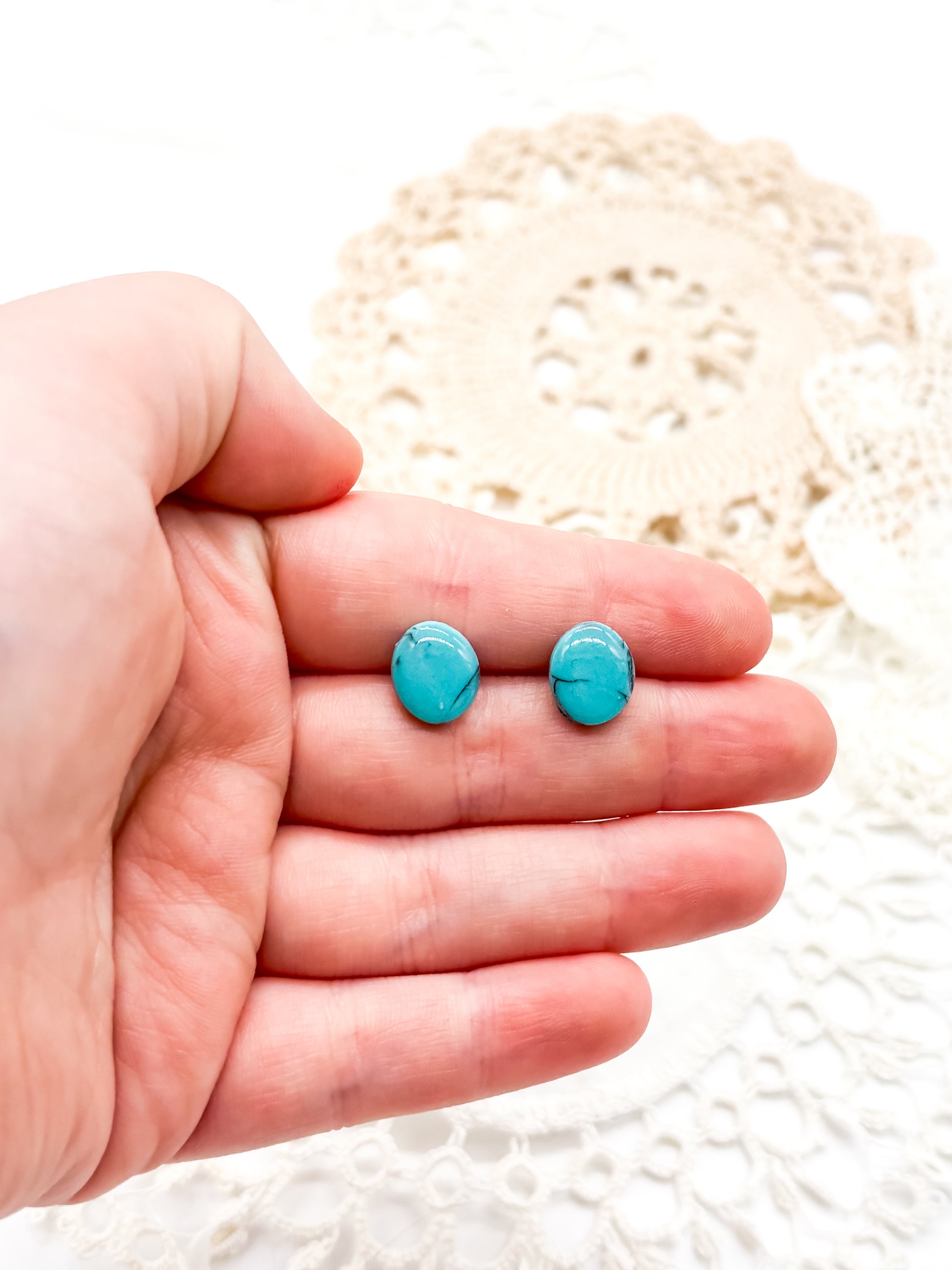 These charming studs feature an organic circle shape crafted from polymer clay in a faux turquoise finish. Lightweight and stylish, they add a playful yet sophisticated touch to any outfit, perfect for everyday wear or special occasions.