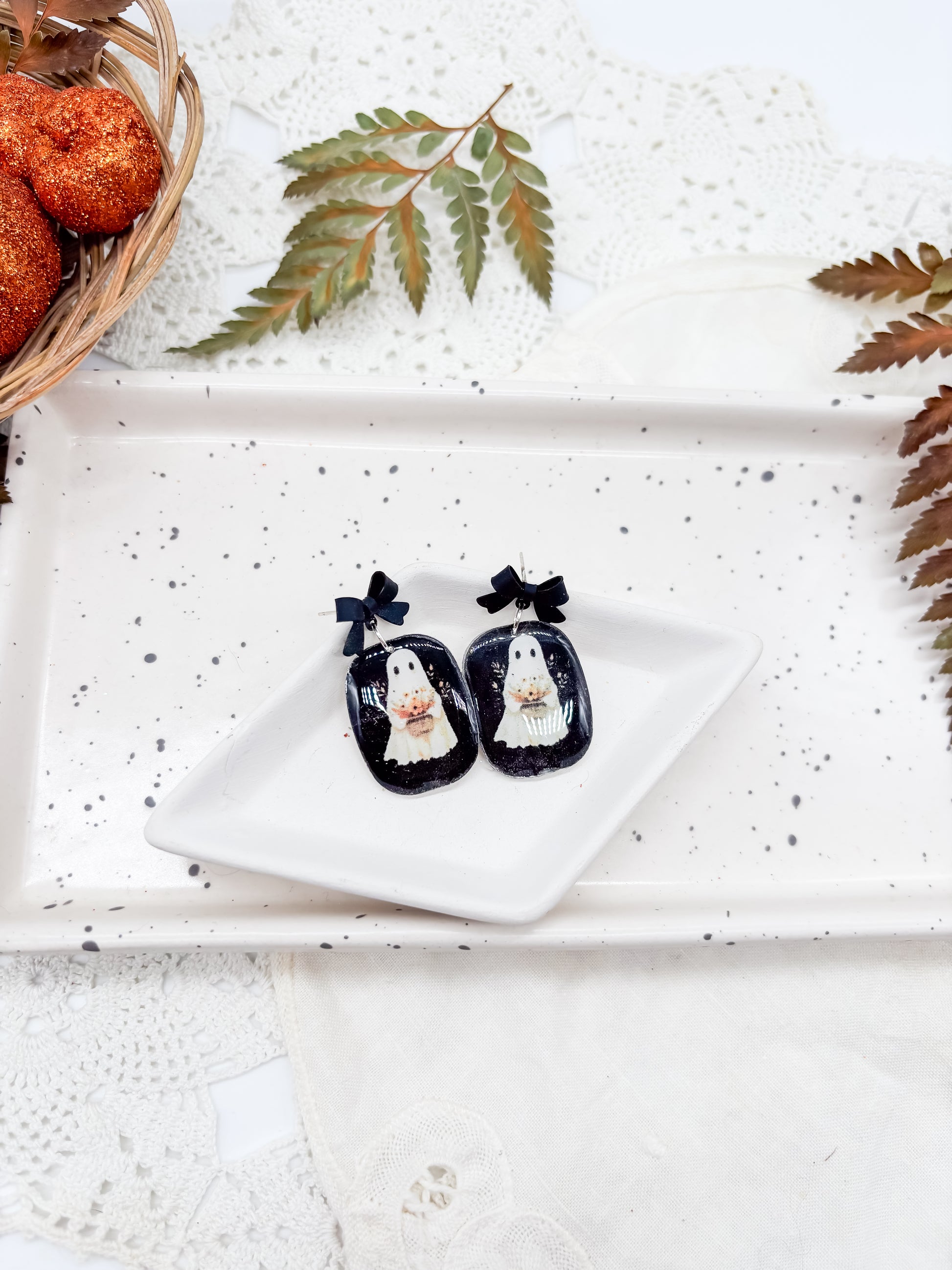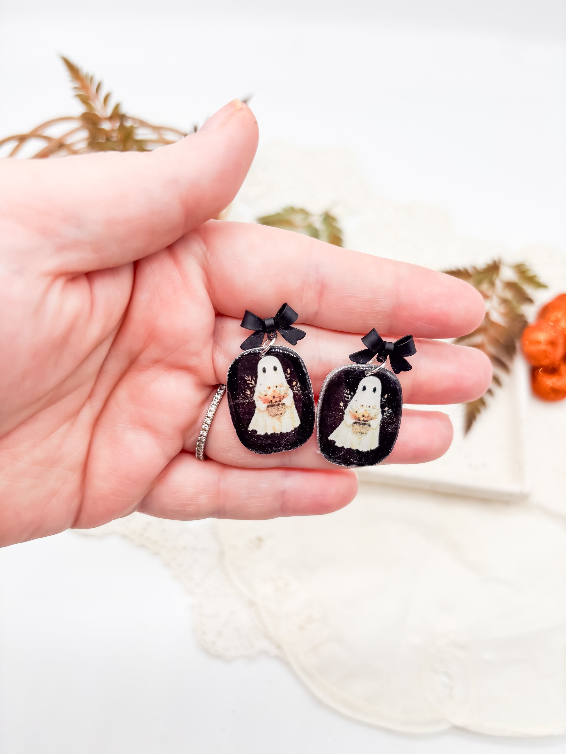 These vintage boho-style polymer clay dangle earrings feature whimsical ghosties holding baskets of flowers, accented with black bow posts edged in silver or gold. Lightweight and charming, they add a subtle touch of nostalgic elegance and playful personality to any outfit.