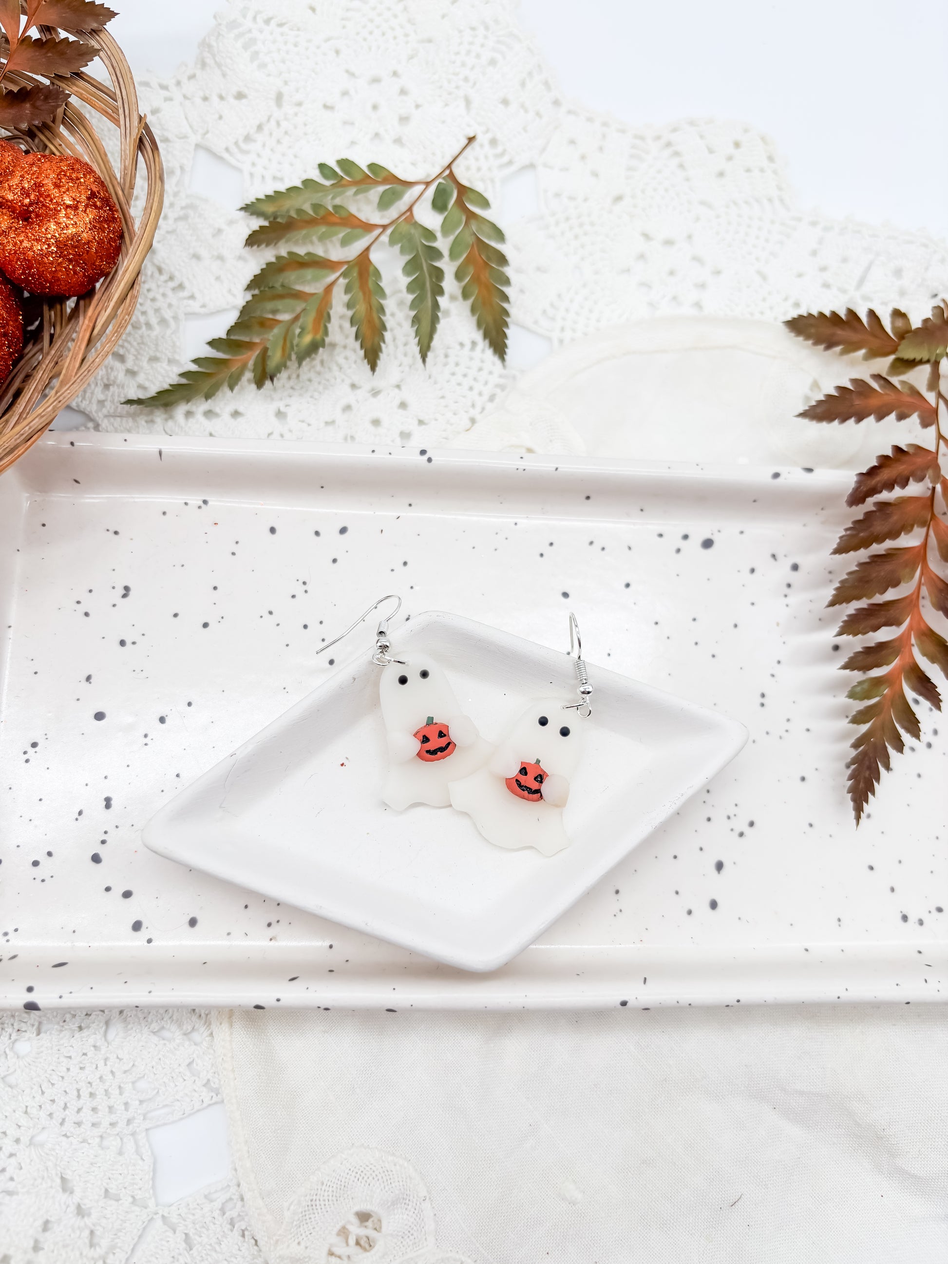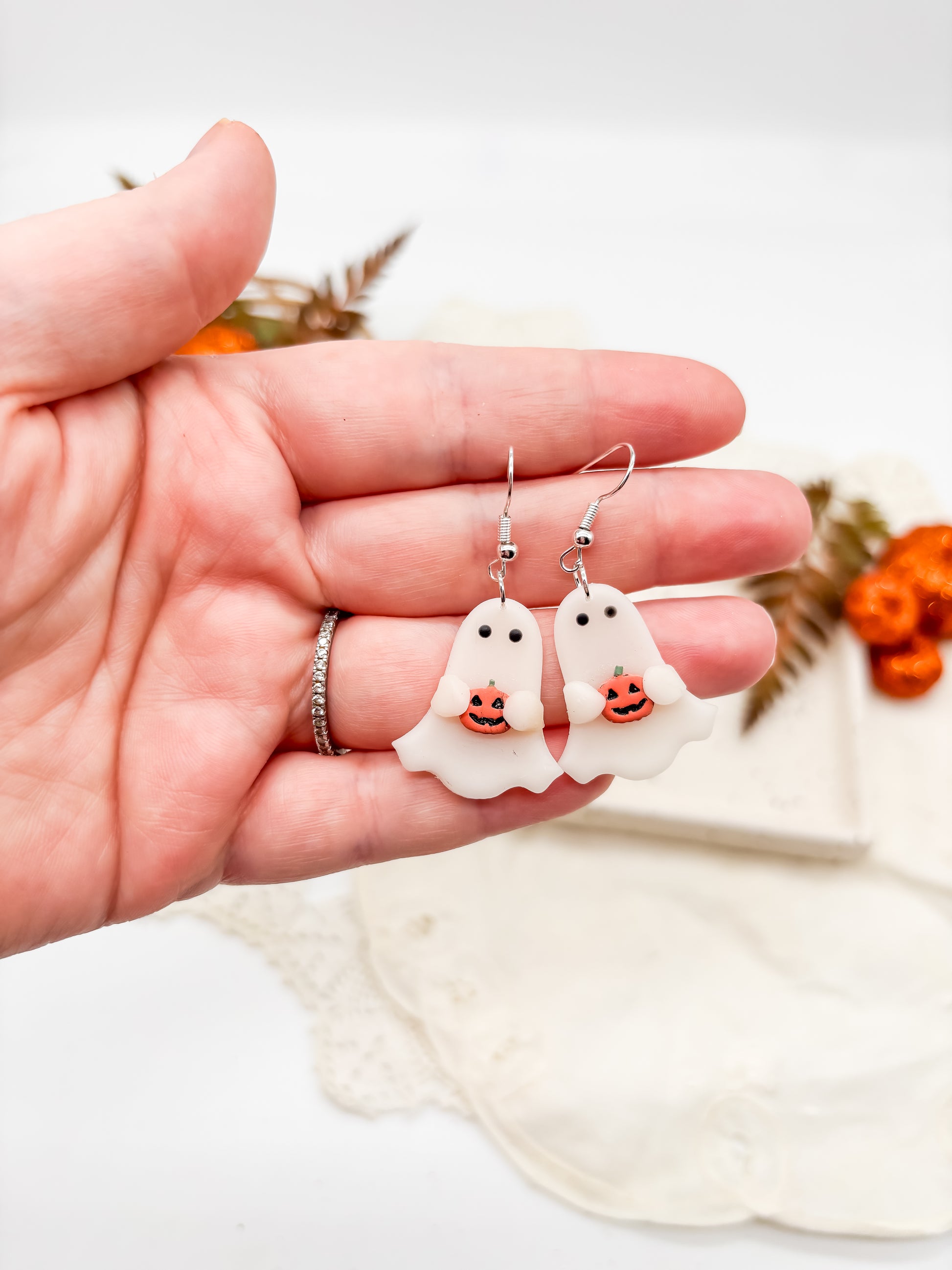 These charming polymer clay earrings feature a slightly translucent ghostie holding a classic jack-o-lantern, blending spooky and sweet in one design. Available with silver or gold-plated hooks, they provide a lightweight, comfortable fit while adding a whimsical touch to your Halloween accessories.
